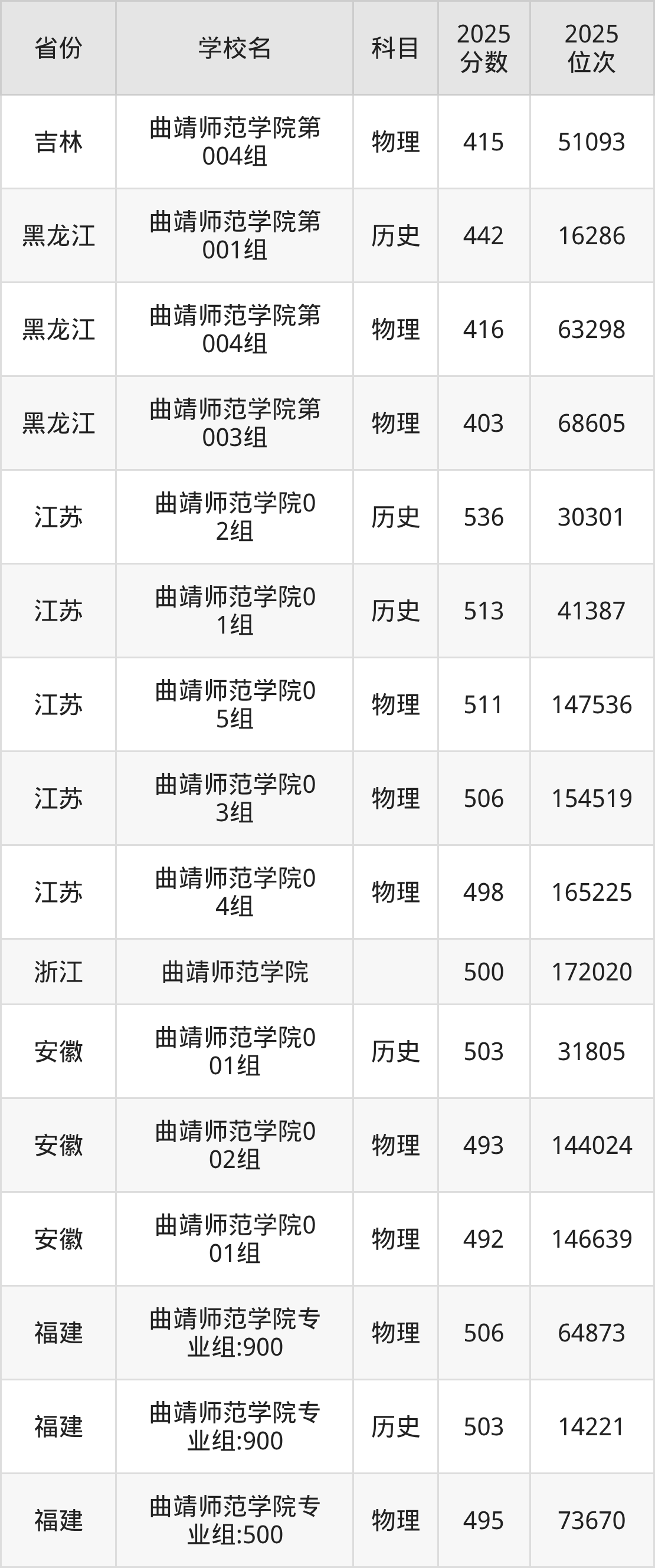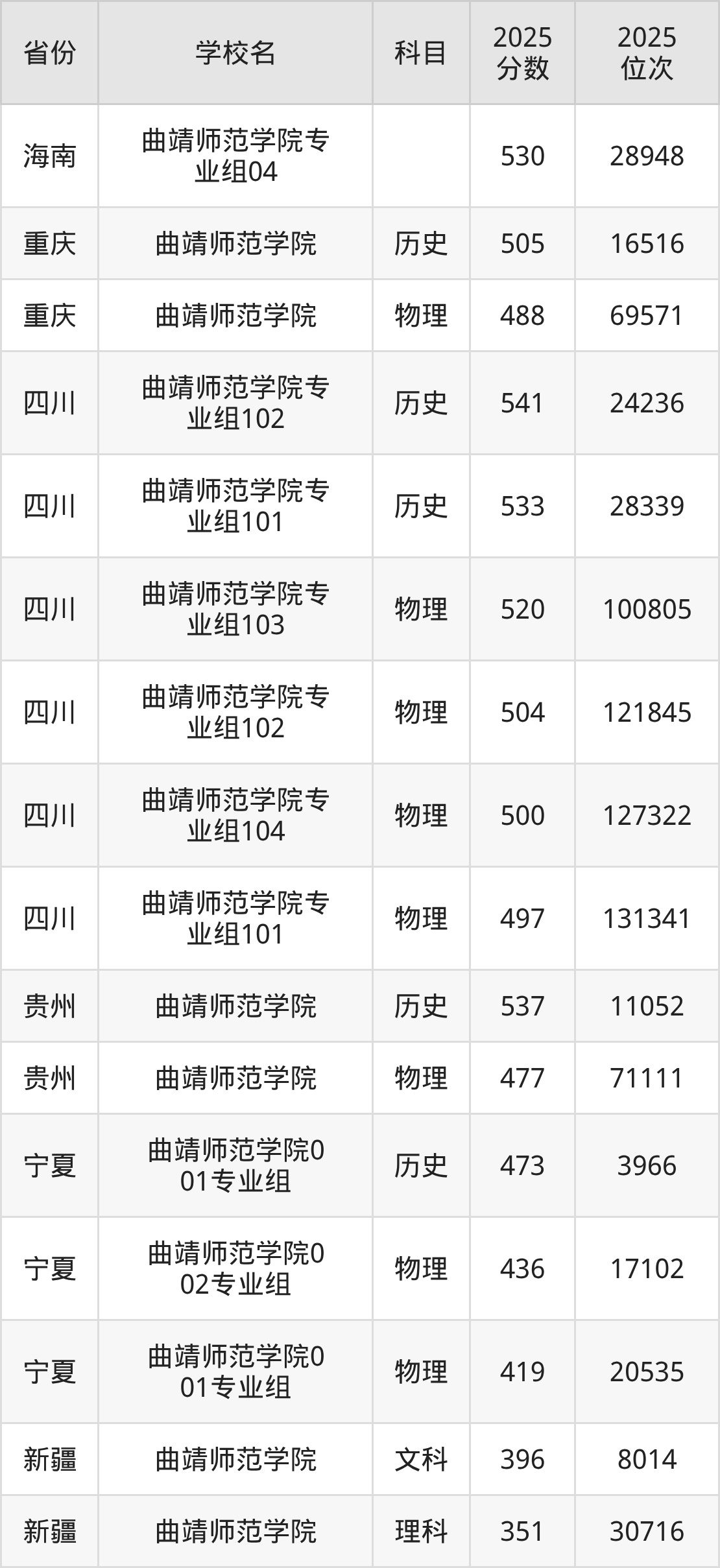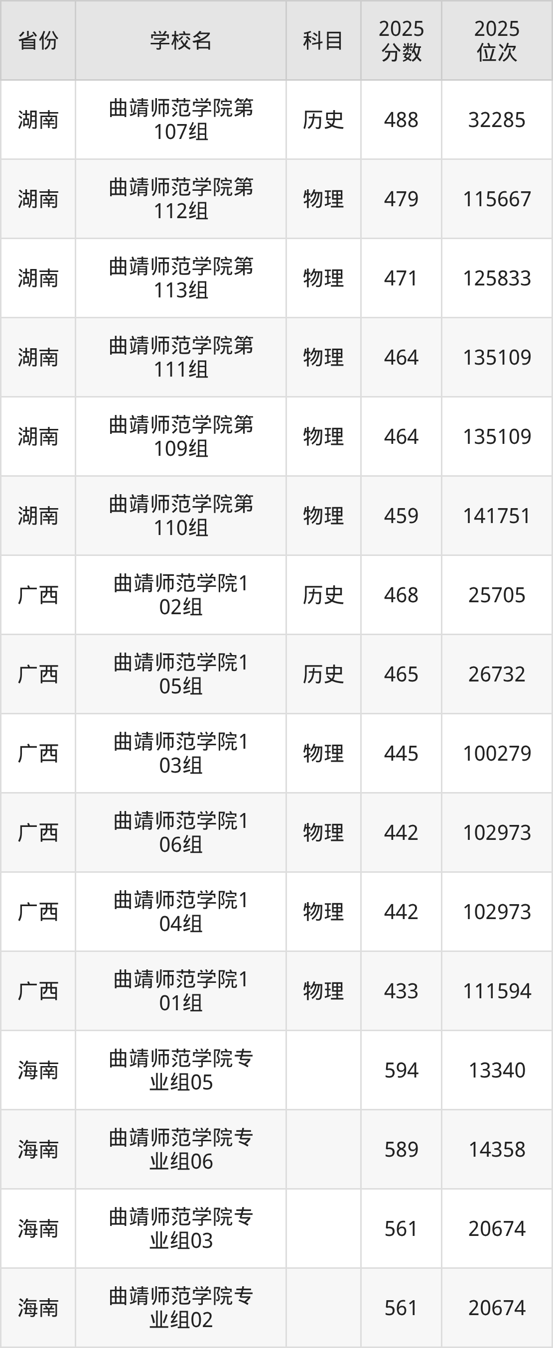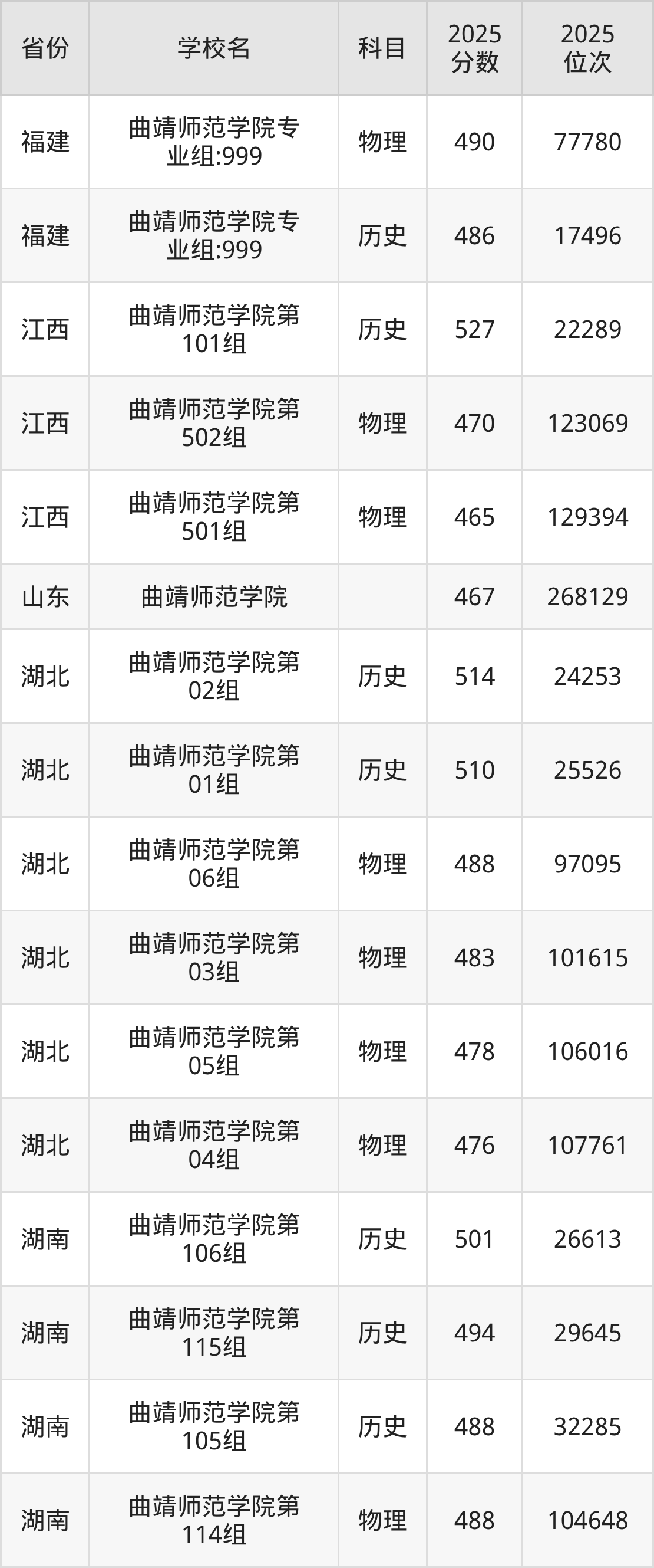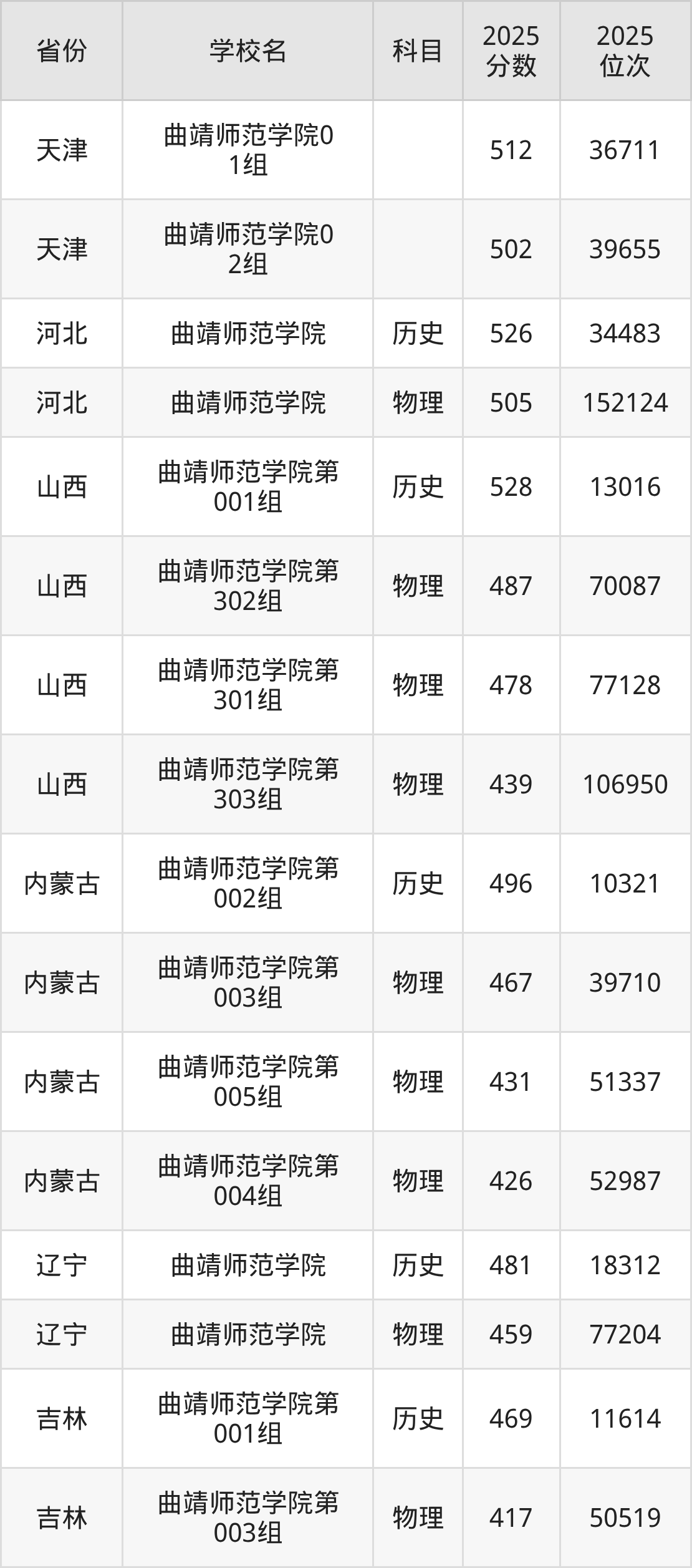 2026年曲靖师范学院录取分数线预计在480分及以上,在各省录取最低分存在一定差异,如:2025年曲靖师范学院在贵州录取最低历史类537分、物理类477分,在山西录取最低历史类528分、物理类439分,在宁夏录取最低历史类473分、物理类419分。