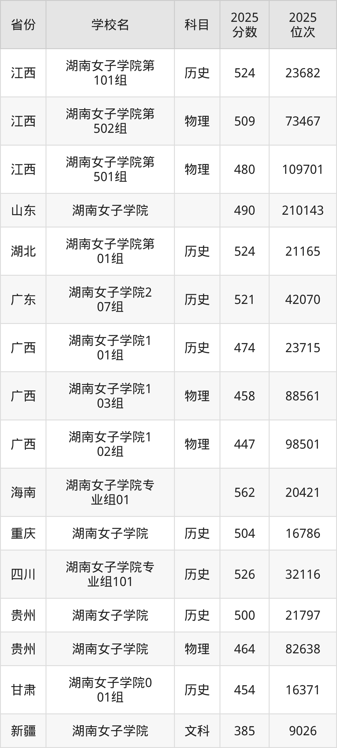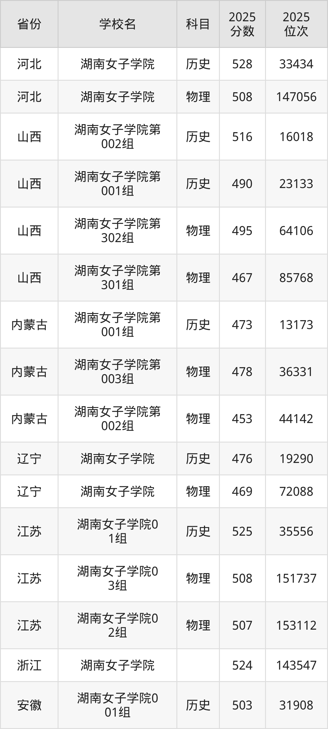 2025年湖南女子学院历史类最低分493分(30102名)、物理类最低分463分(136388名)。