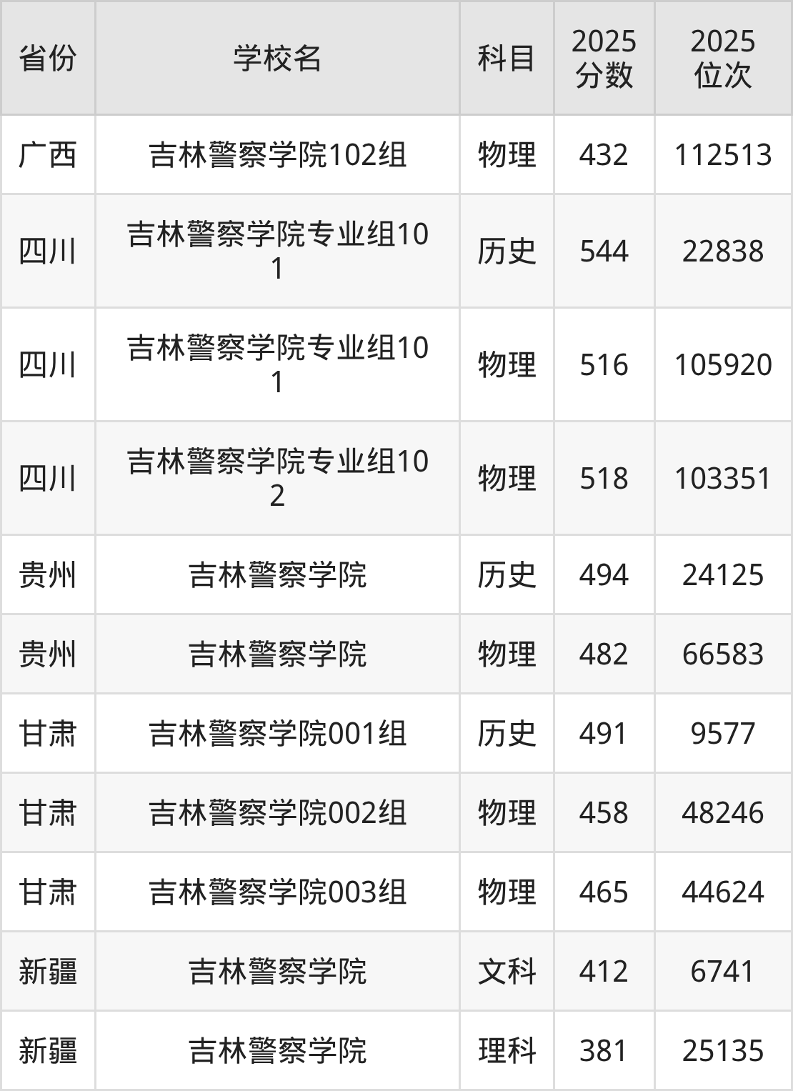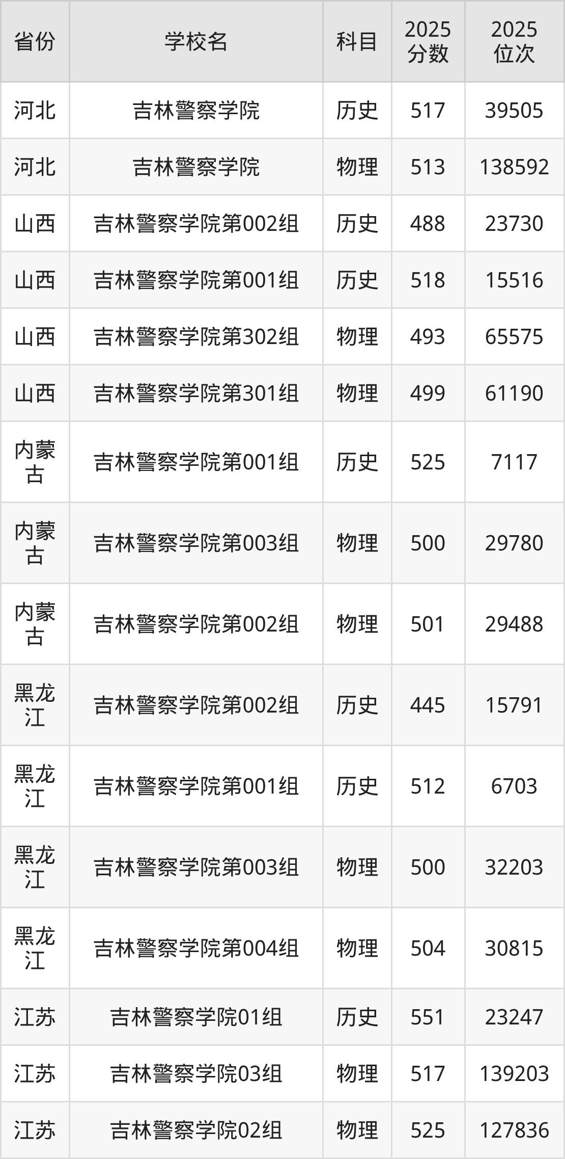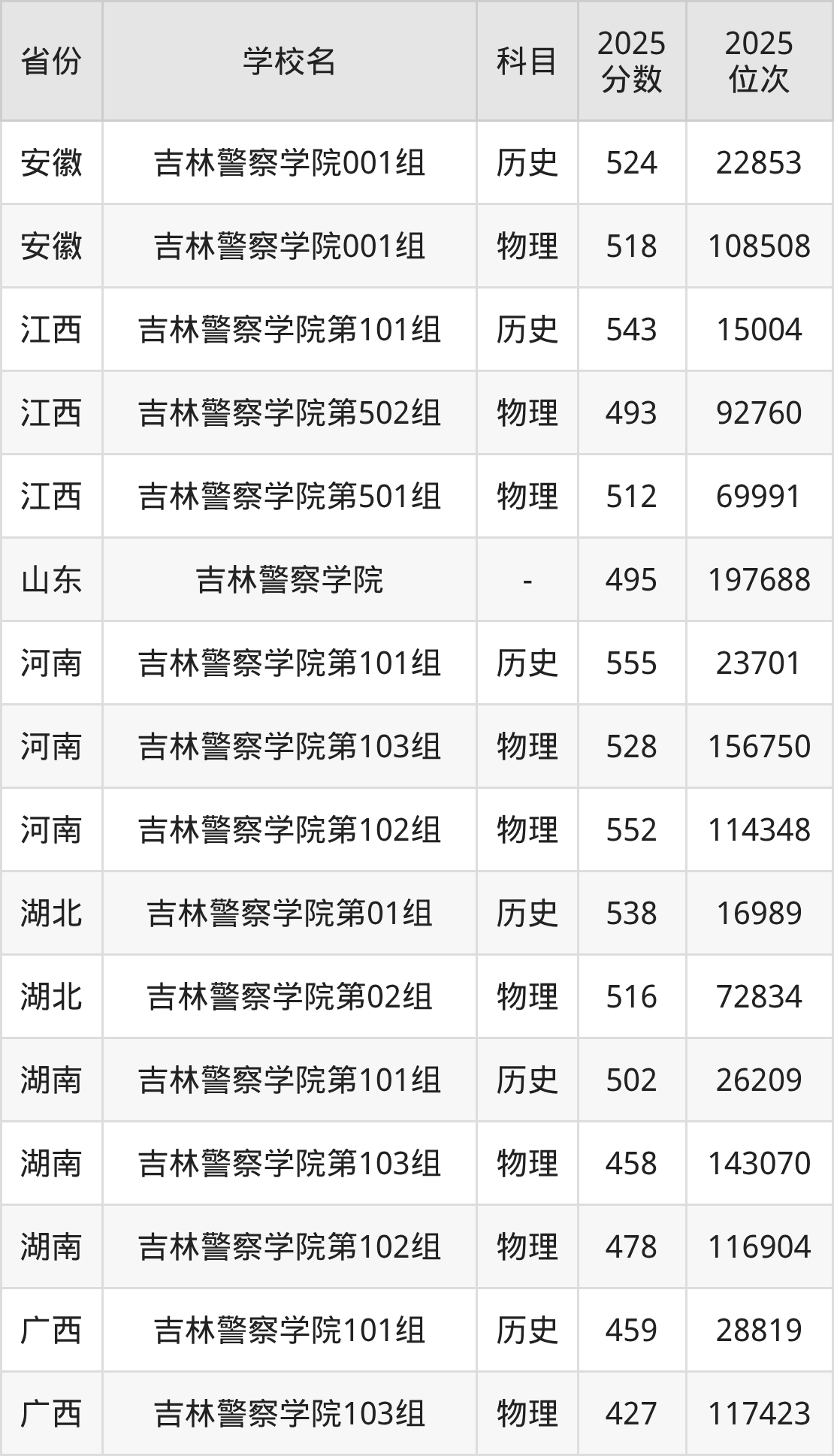 2025年吉林警察学院历史类最低分473分(11085名)、物理类最低分421分(49343名)。