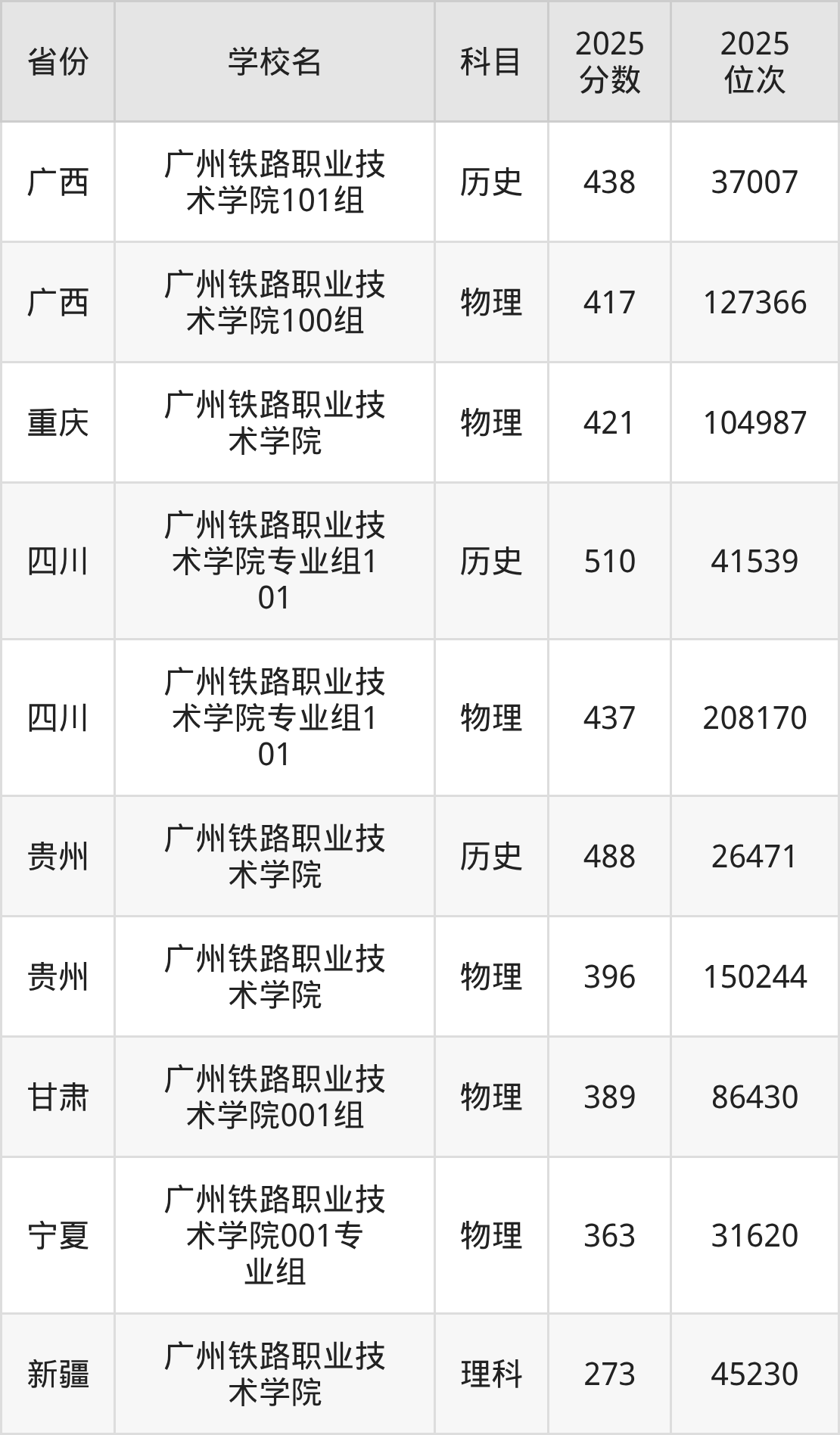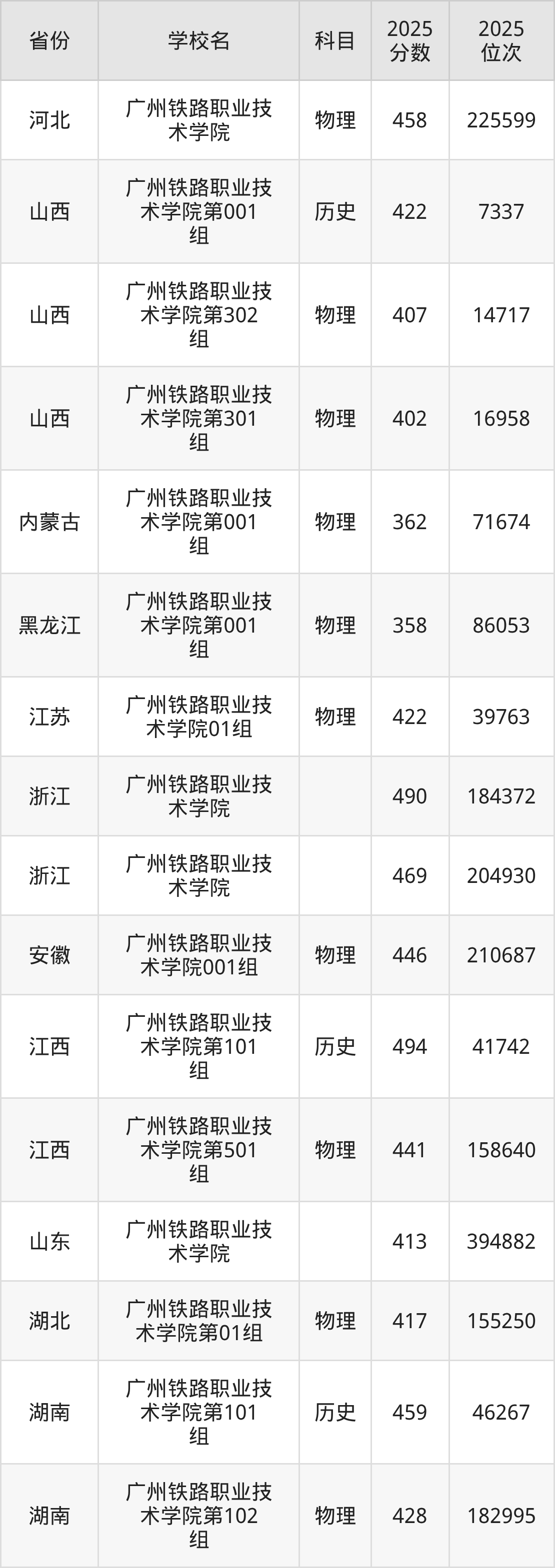 下面是广州铁路职业技术学院2025年录取分数线各省汇总,一起来了解下吧。