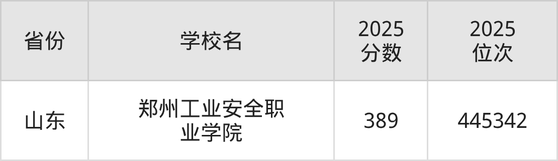 2025年郑州工业安全职业学院在省外录取分数线是389分,录取分数线最低在山东。