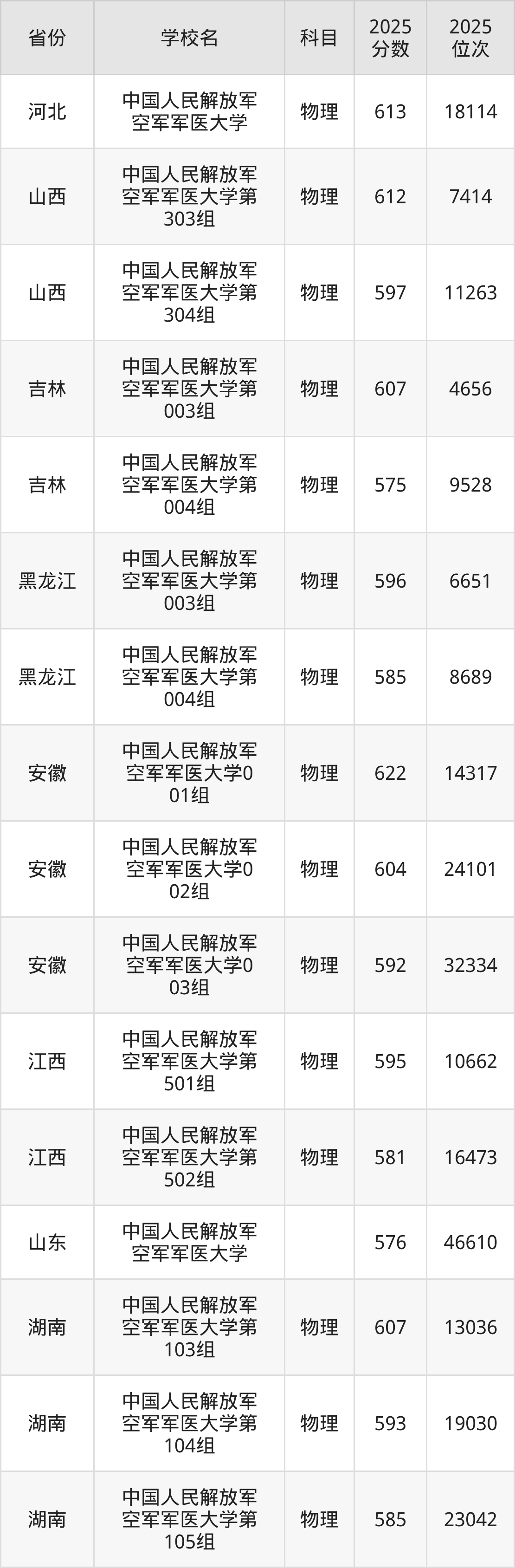 2025年中国人民解放军空军军医大学物理类最低分613分(18114名)。