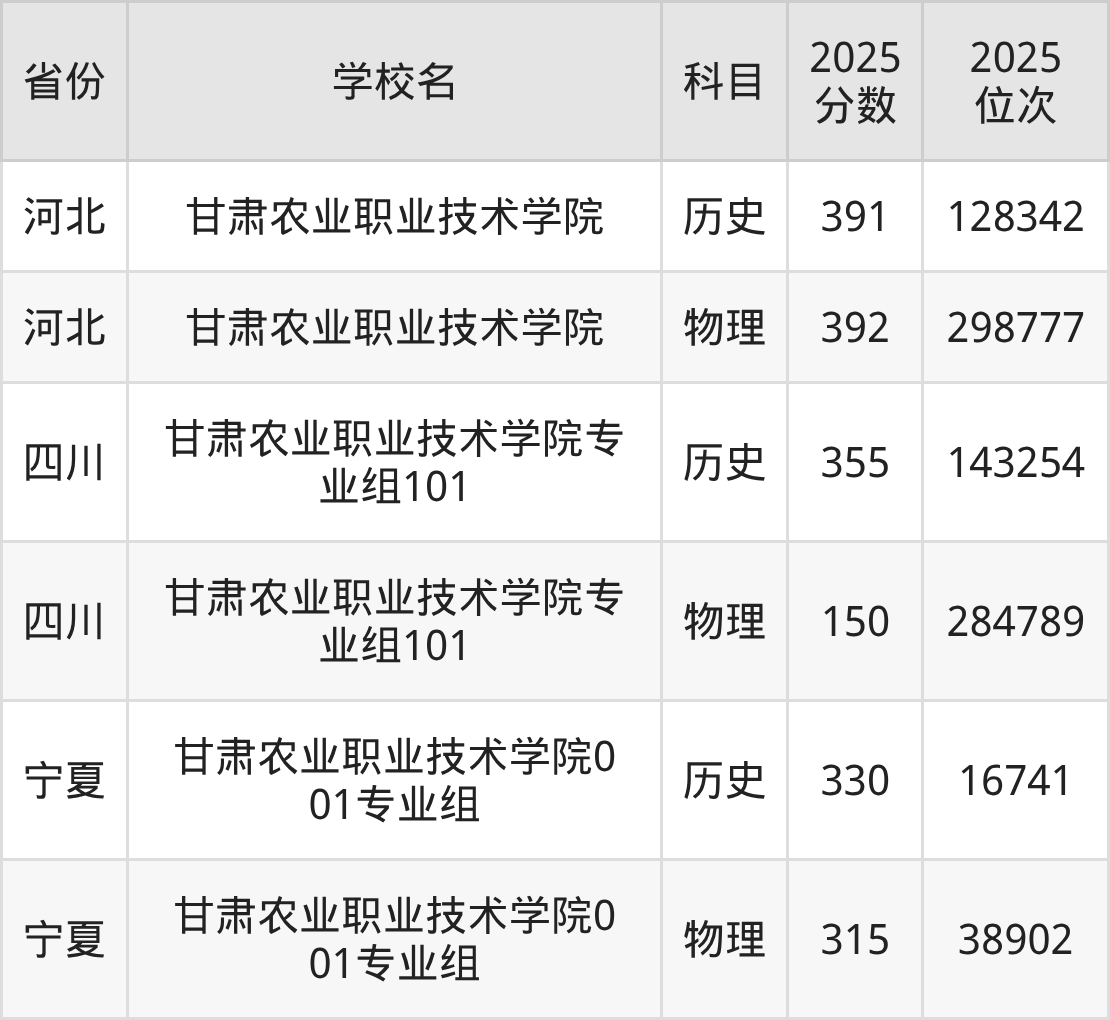 2025年甘肃农业职业技术学院历史类最低分231分(56087名)、物理类最低分218分(120496名)。