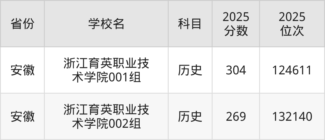 2026年浙江育英职业技术学院录取分数线预计在360分及以上,在各省录取最低分存在一定差异,如:2025年浙江育英职业技术学院在浙江录取最低分是411分,在安徽录取最低历史类269分。