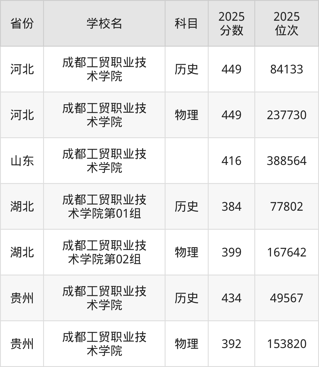 2025年成都工贸职业技术学院在省外录取分数线范围整体位于384分到449分之间,录取分数线最低在湖北历史(第01组)、录取分数线最高在河北物理。