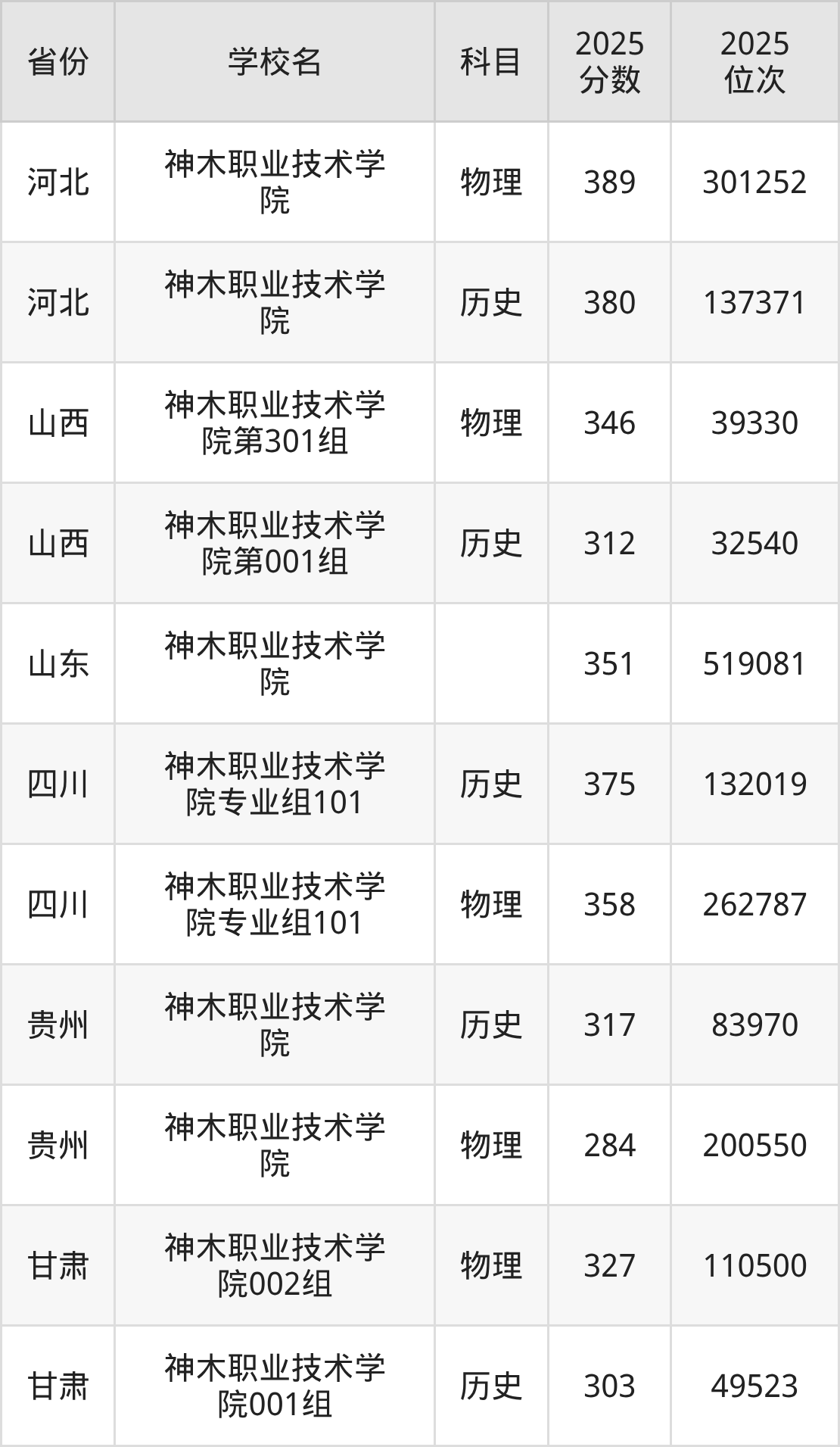 2026年神木职业技术学院录取分数线预计在340分及以上,在各省录取最低分存在一定差异,如:2025年神木职业技术学院在四川录取最低历史类375分、物理类358分,在贵州录取最低历史类317分、物理类284分,在甘肃录取最低历史类303分、物理类327分。