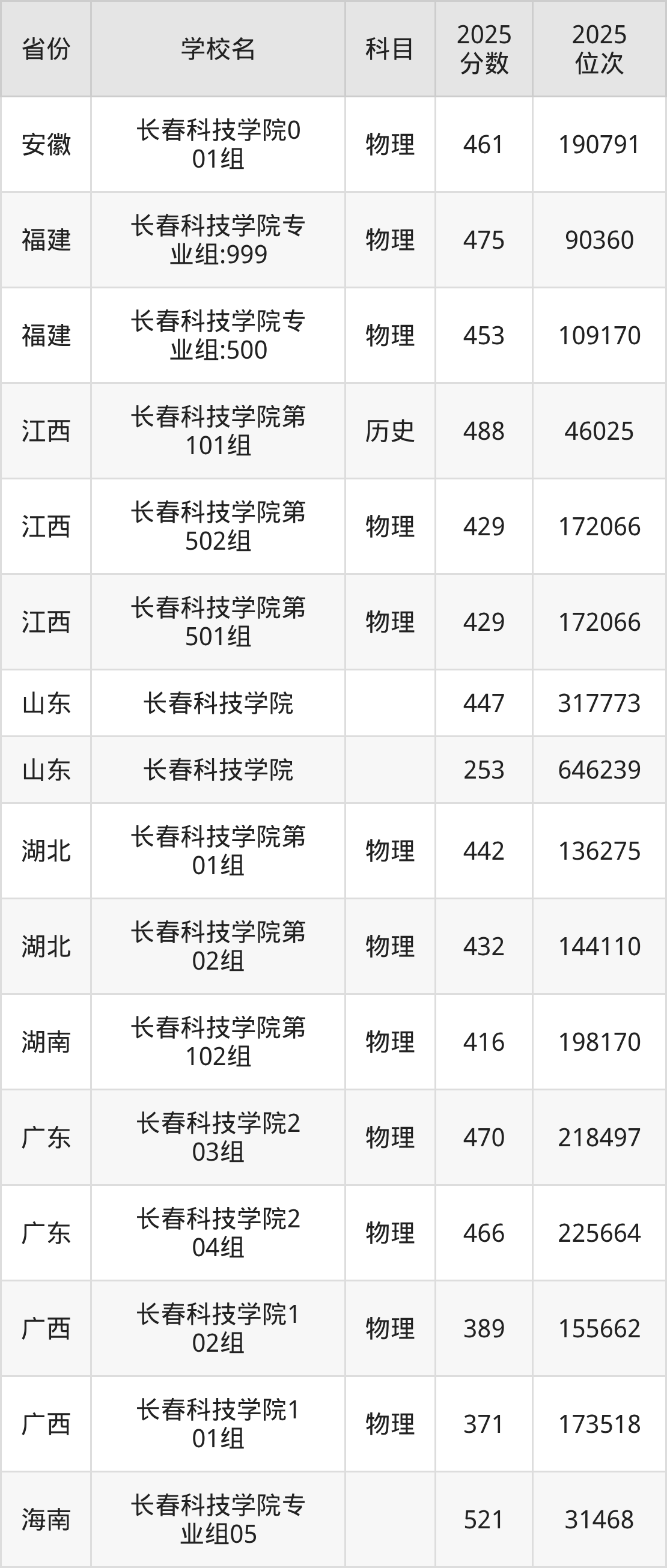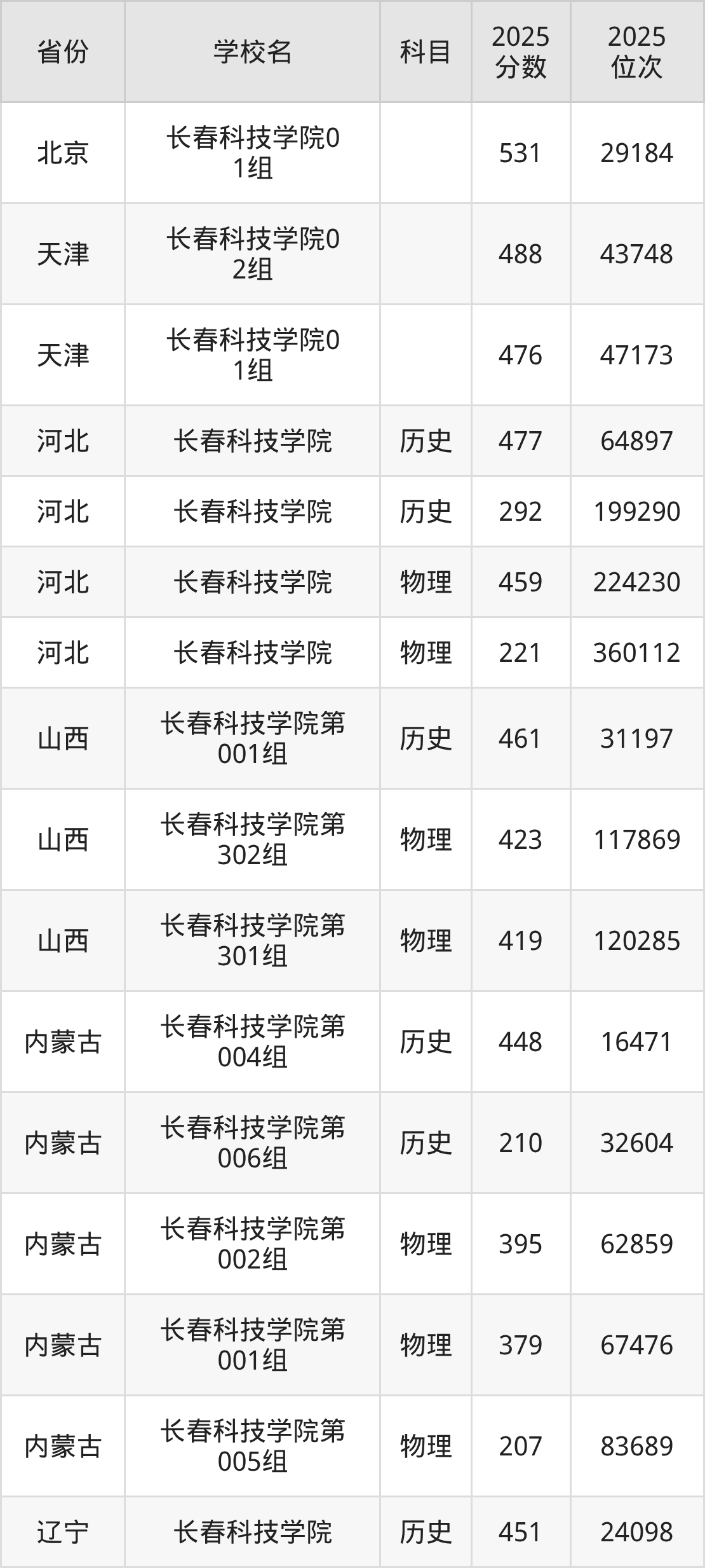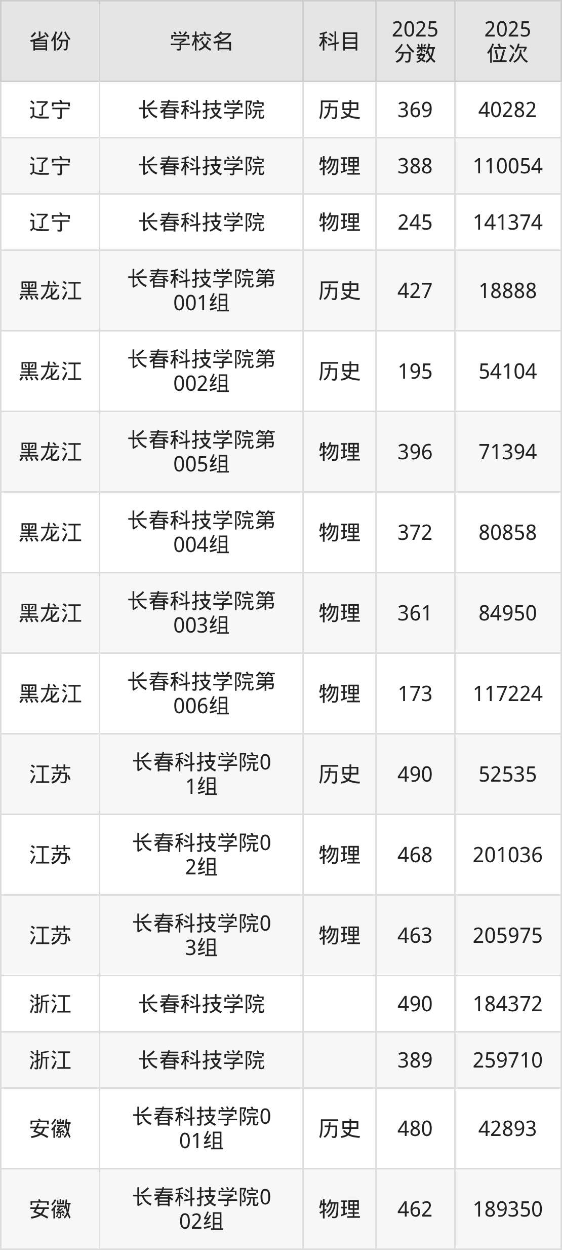 2025年长春科技学院历史类最低分302分(27630名)、物理类最低分205分(78838名)。