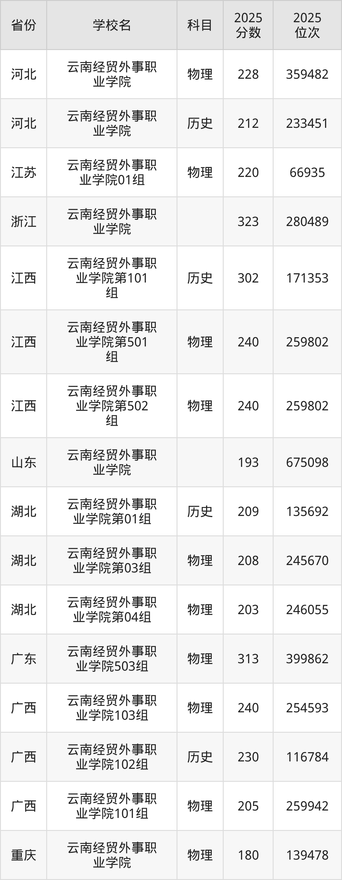 2025年云南经贸外事职业学院在省外录取分数线范围整体位于150分到323分之间,录取分数线最低在四川历史(专业组101)、录取分数线最高在浙江。