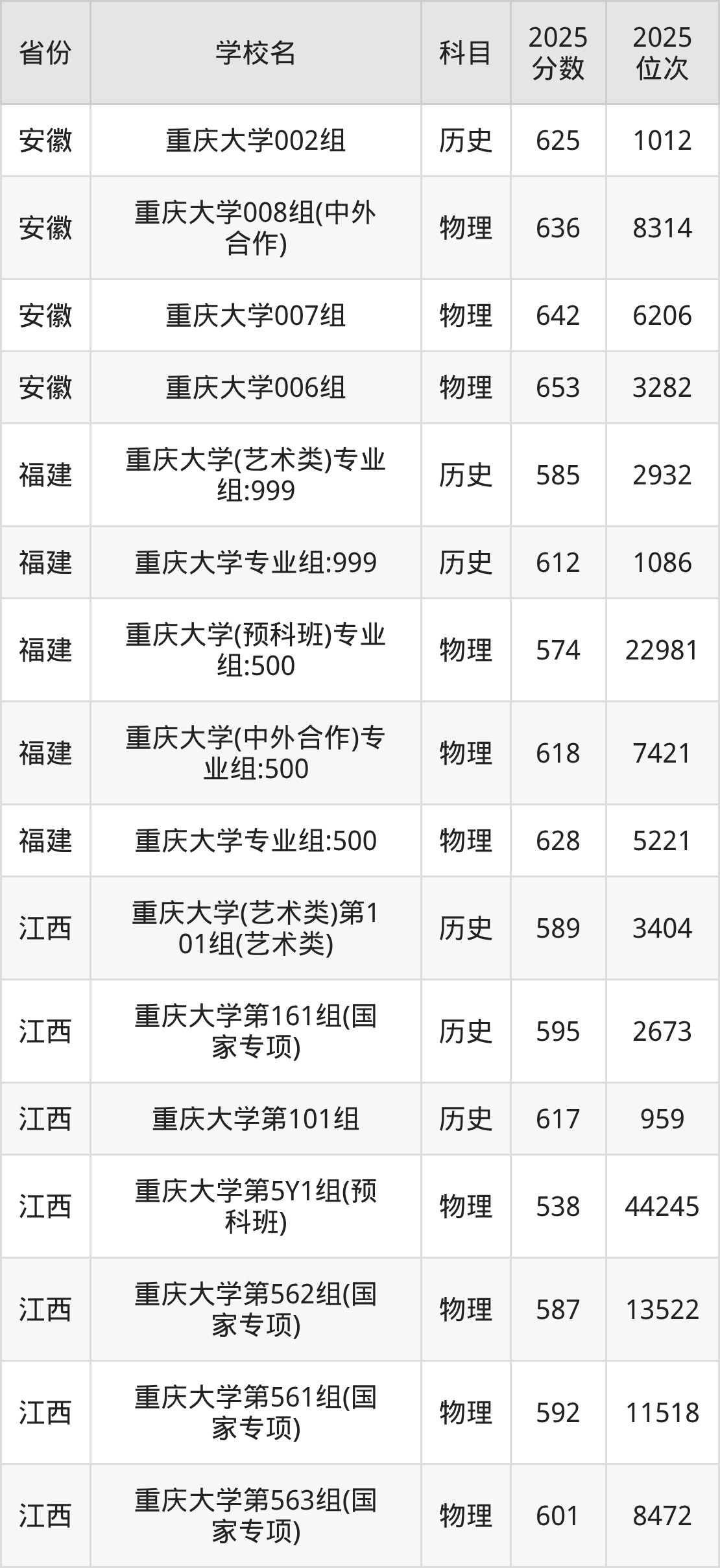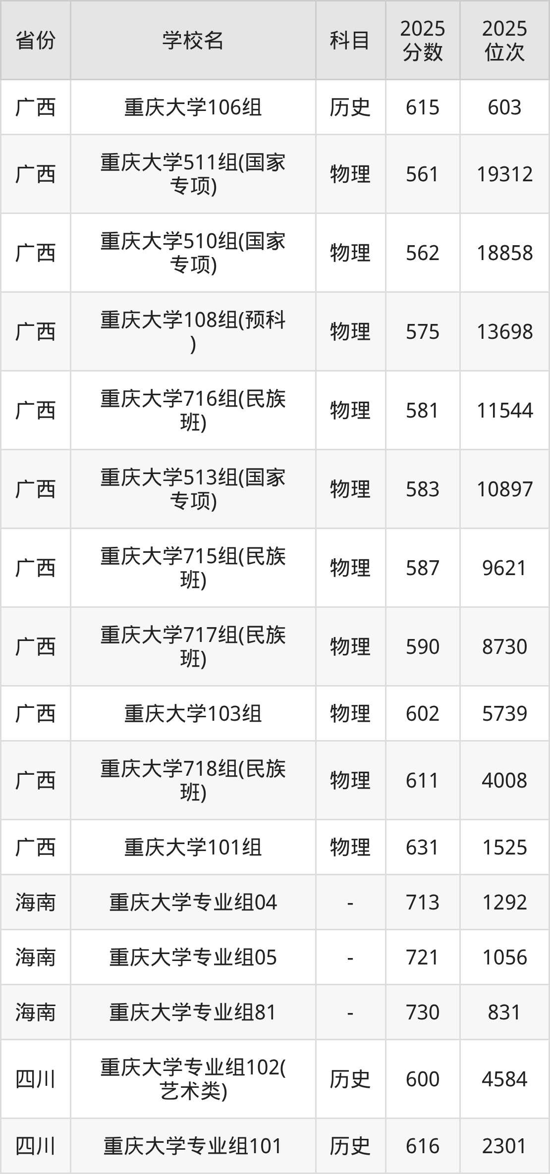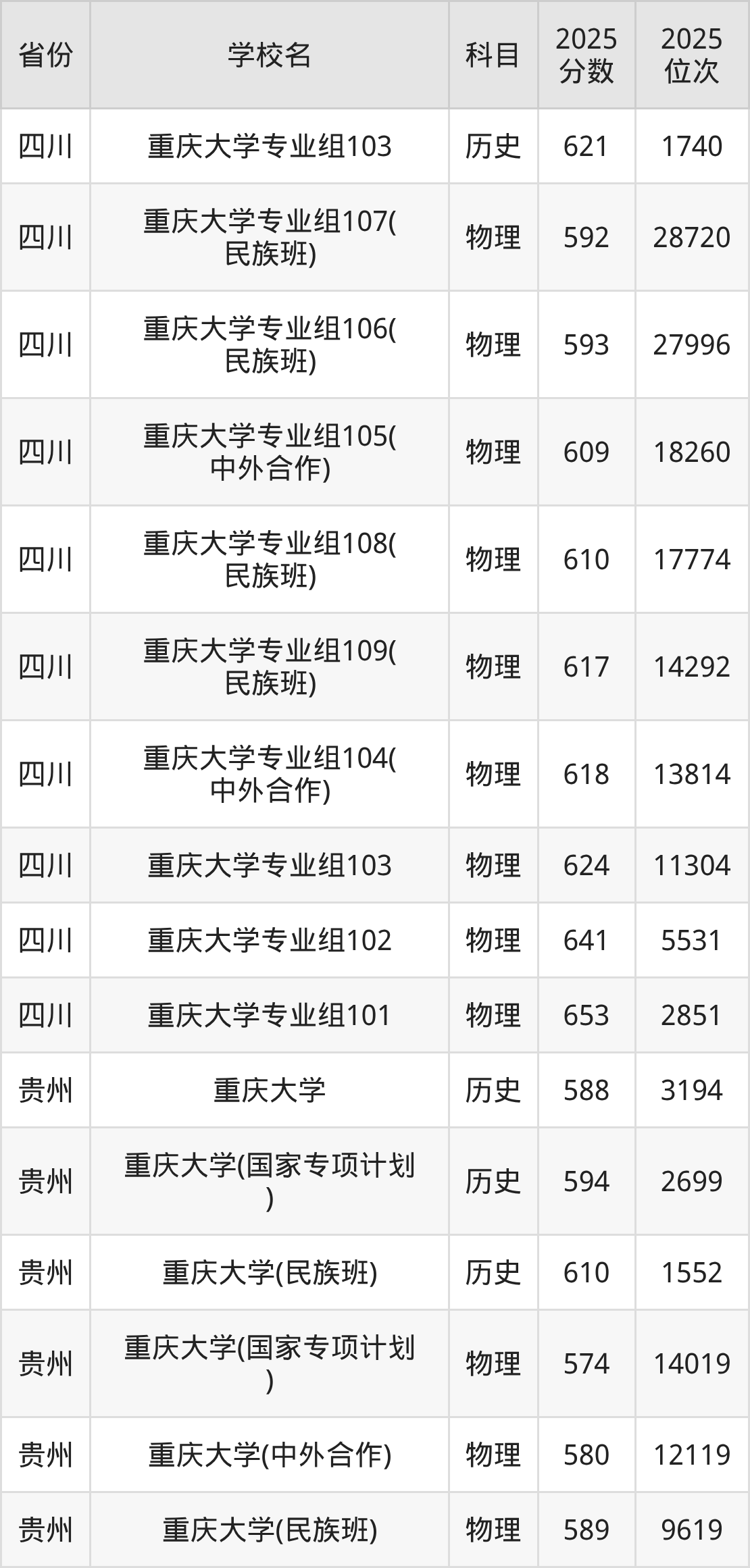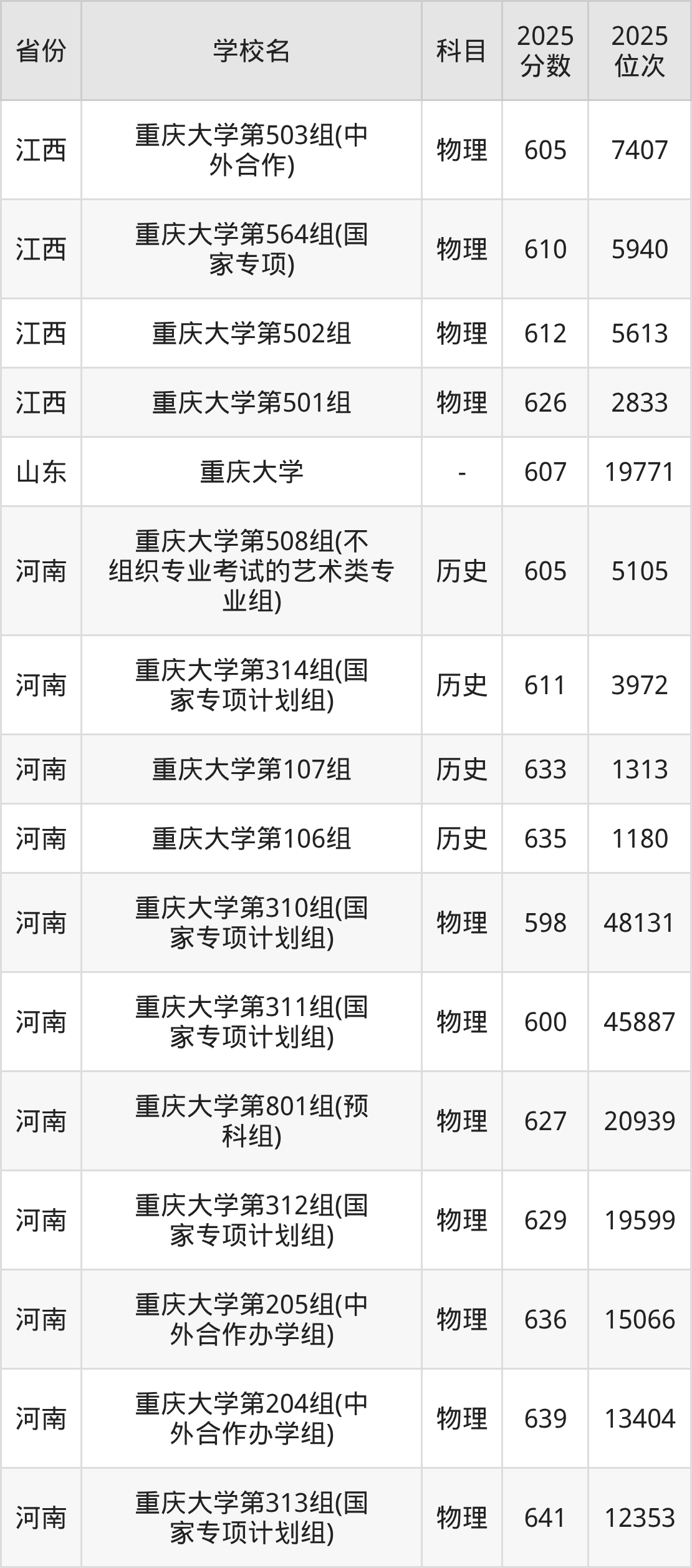 2025年重庆大学历史类最低分560分(5621名)、物理类最低分584分(17147名)。