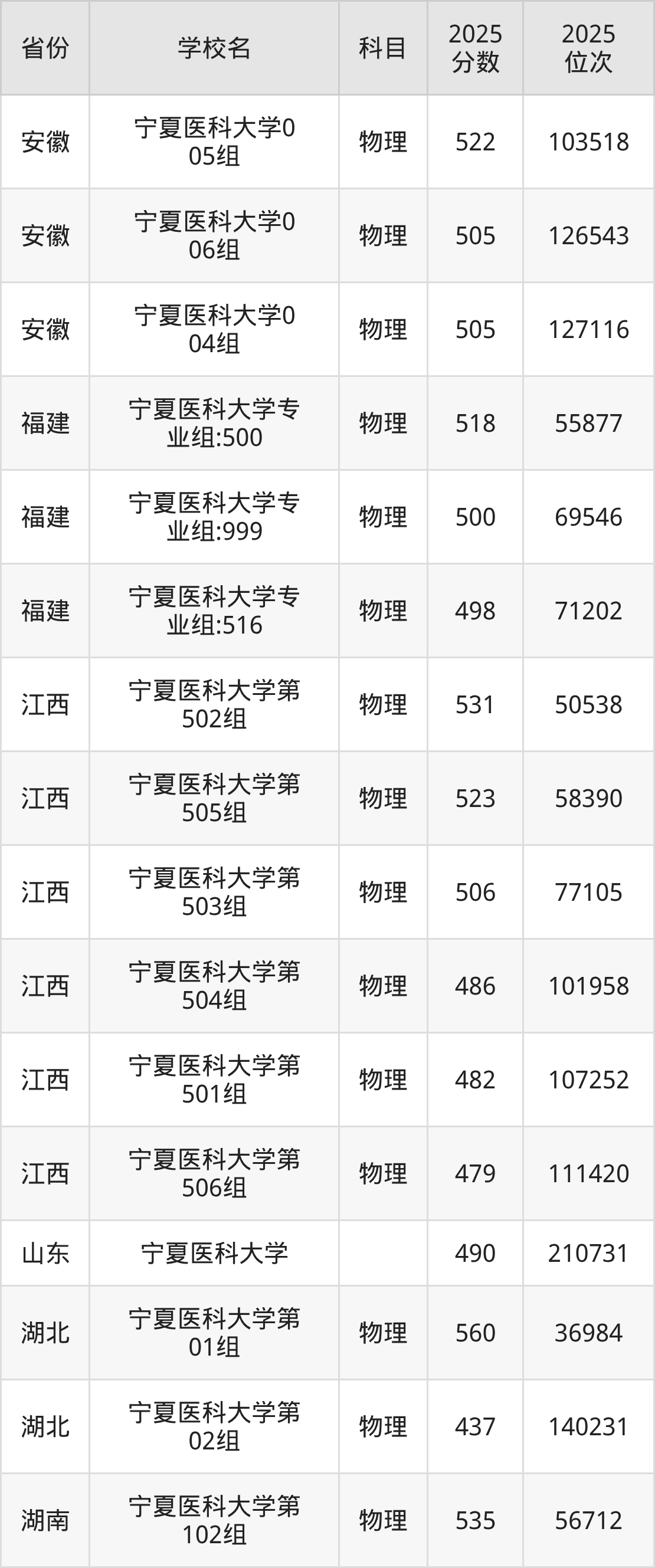 2026年宁夏医科大学录取分数线预计在490分及以上,在各省录取最低分存在一定差异,如:2025年宁夏医科大学在湖南录取最低物理类482分,在山西录取最低物理类504分,在内蒙古录取最低物理类503分。