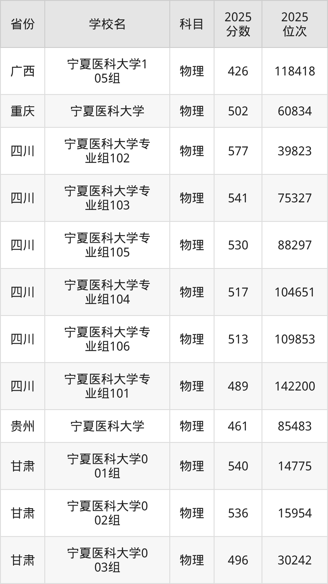 | 宁夏医科大学0 01专业组 | 物理 | 436 | 17102 |