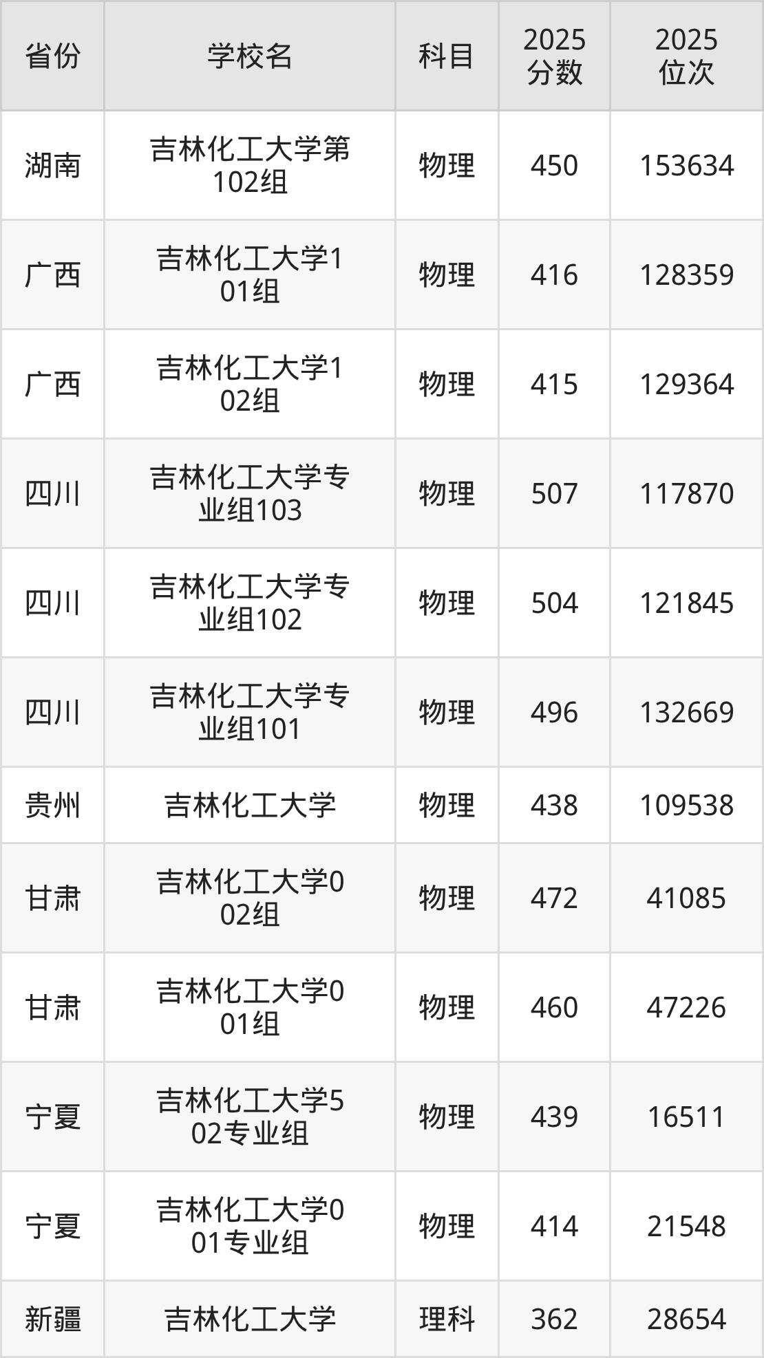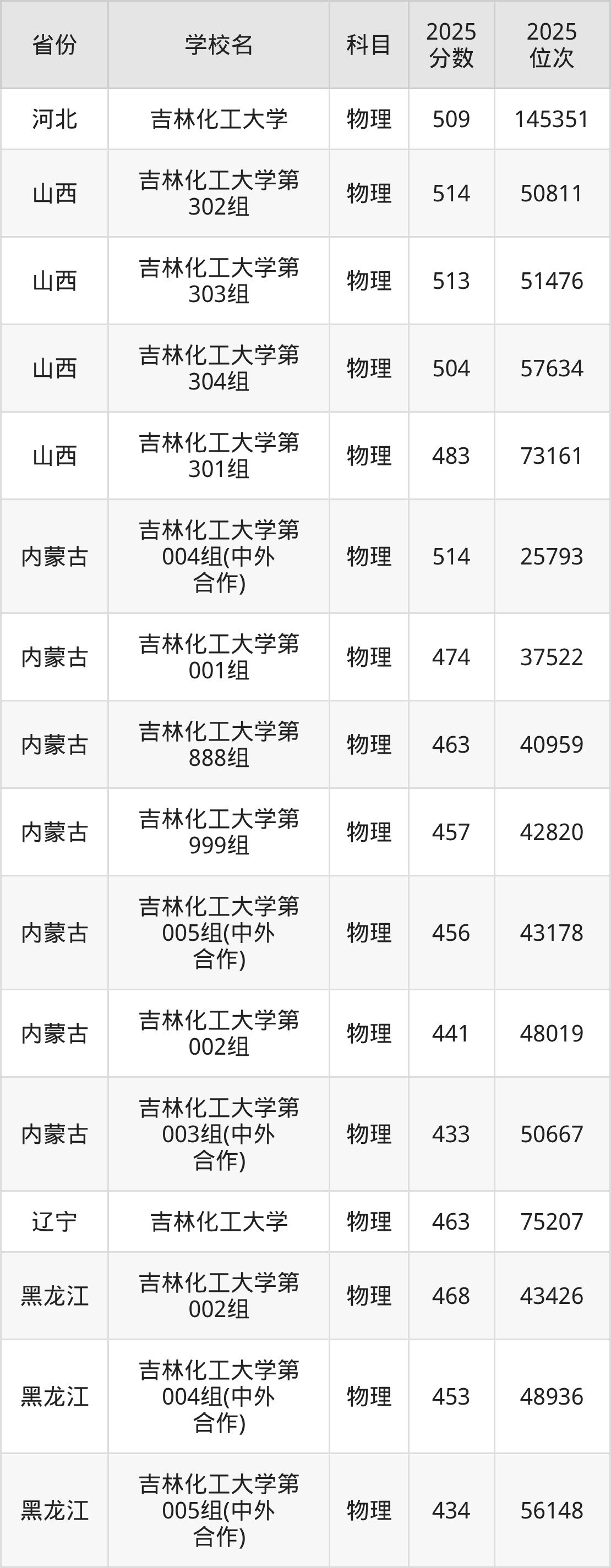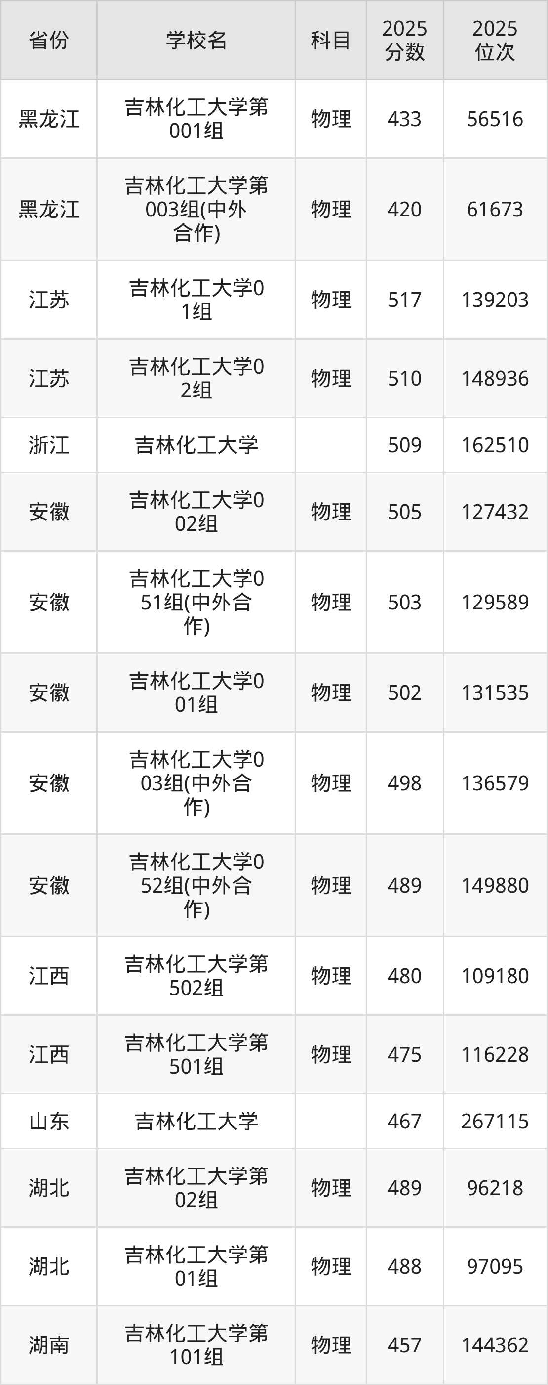 2025年吉林化工大学历史类最低分468分(11743名)、物理类最低分412分(52024名)。