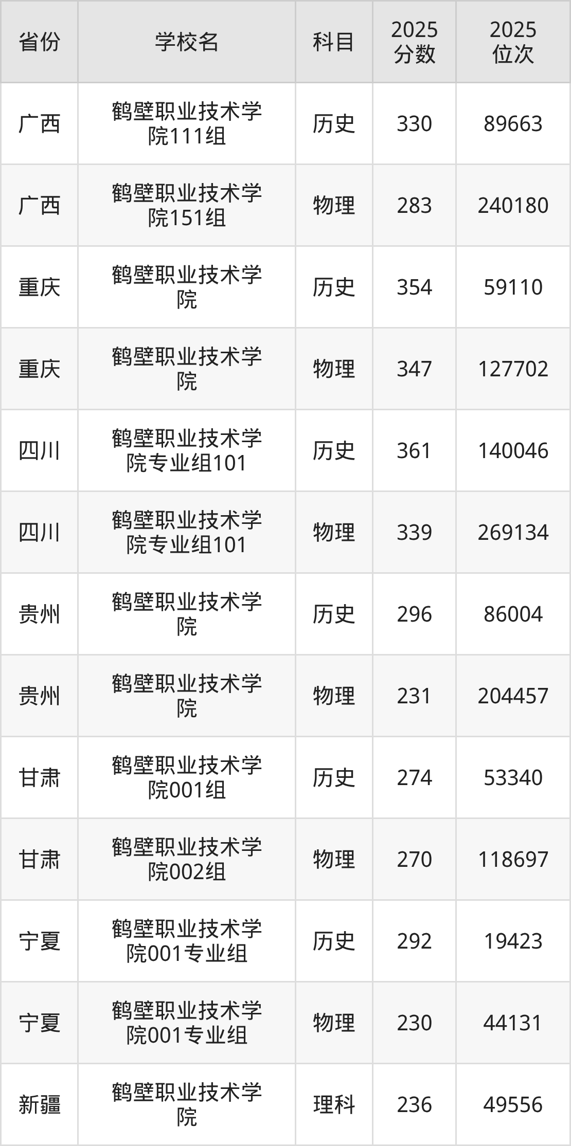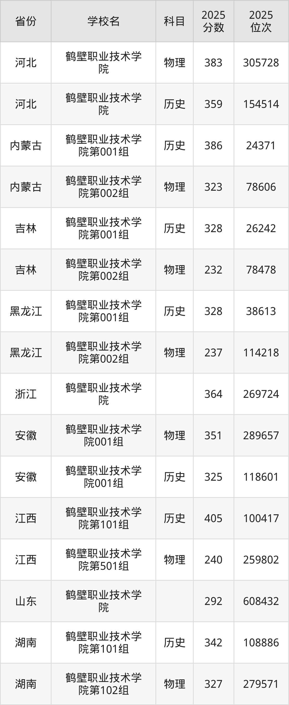 2026年鹤壁职业技术学院录取分数线预计在310分及以上,在各省录取最低分存在一定差异,如:2025年鹤壁职业技术学院在安徽录取最低历史类325分、物理类351分,在湖南录取最低历史类342分、物理类327分,在新疆录取最低理科236分。