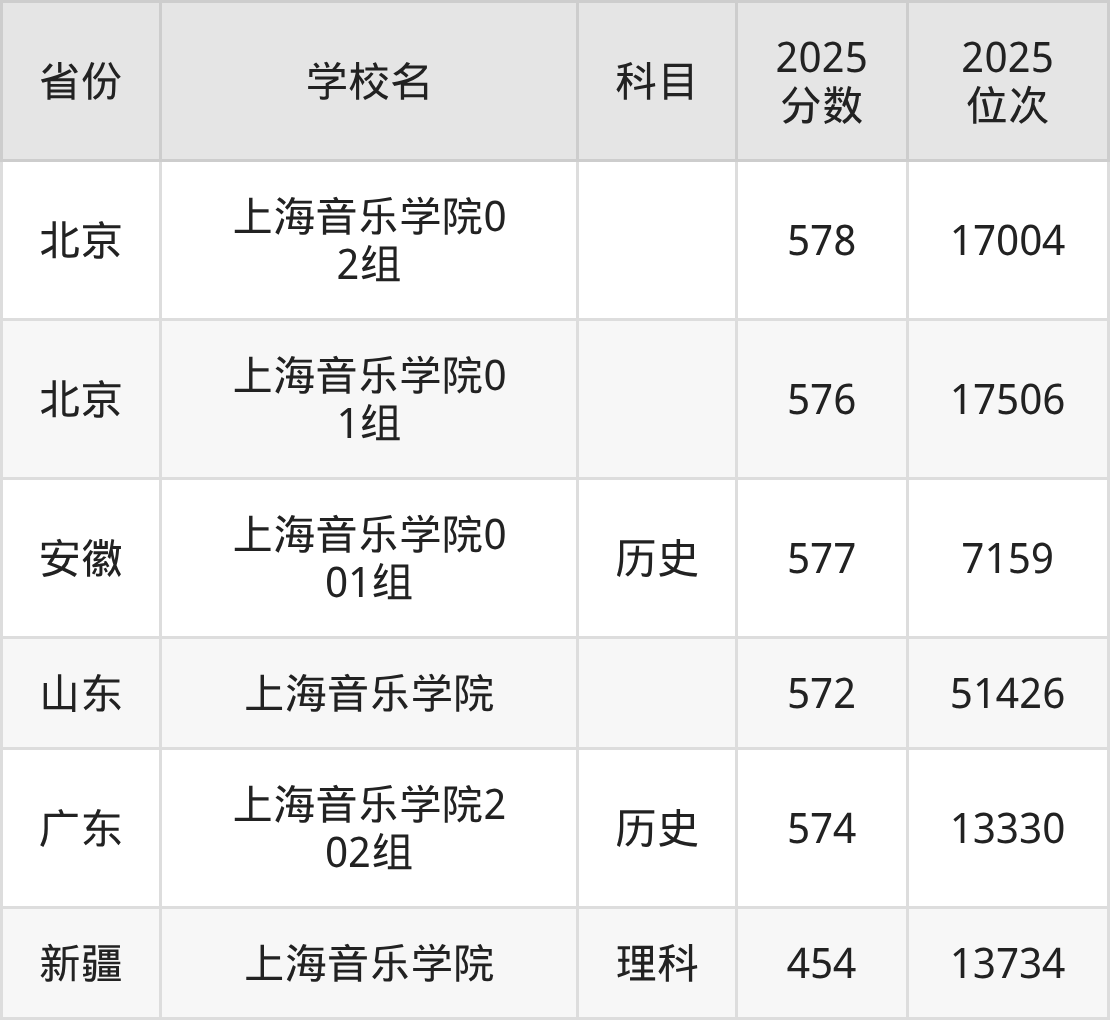 2025年上海音乐学院在市外录取分数线范围整体位于454分到578分之间,录取分数线最低在新疆理科、录取分数线最高在北京(02组)。