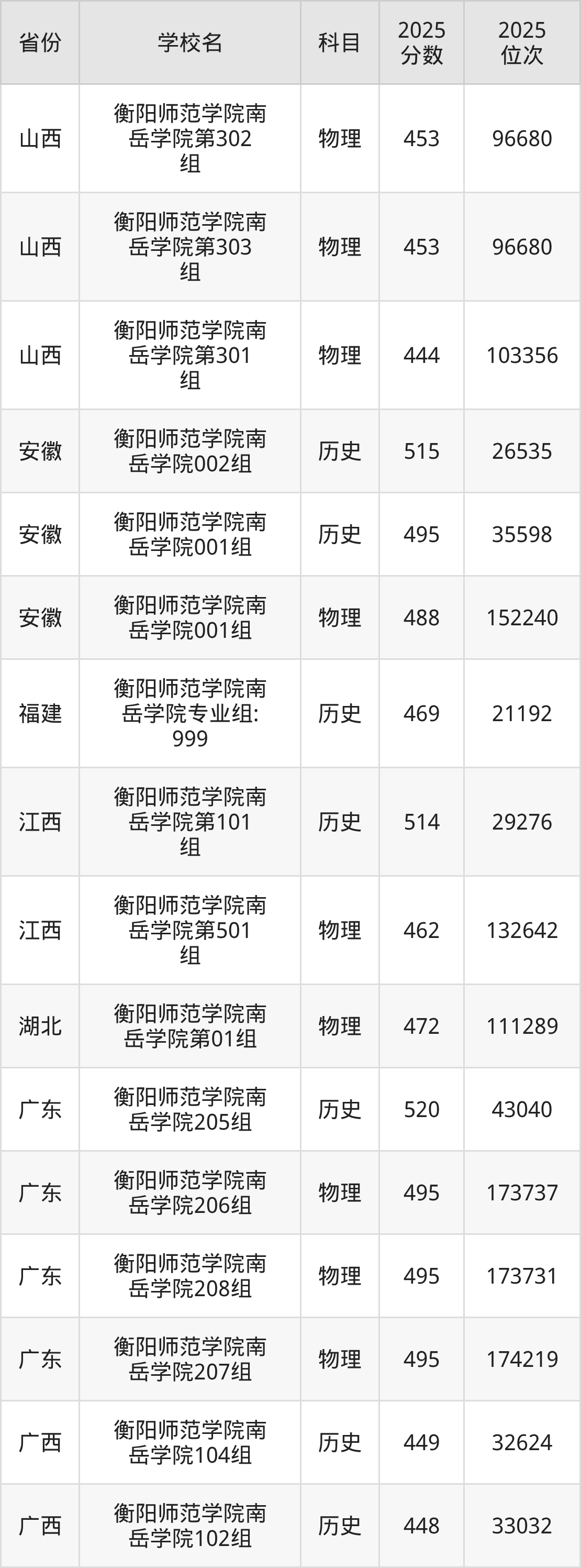 2025年衡阳师范学院南岳学院历史类最低分477分(37270名)、物理类最低分436分(172420名)。