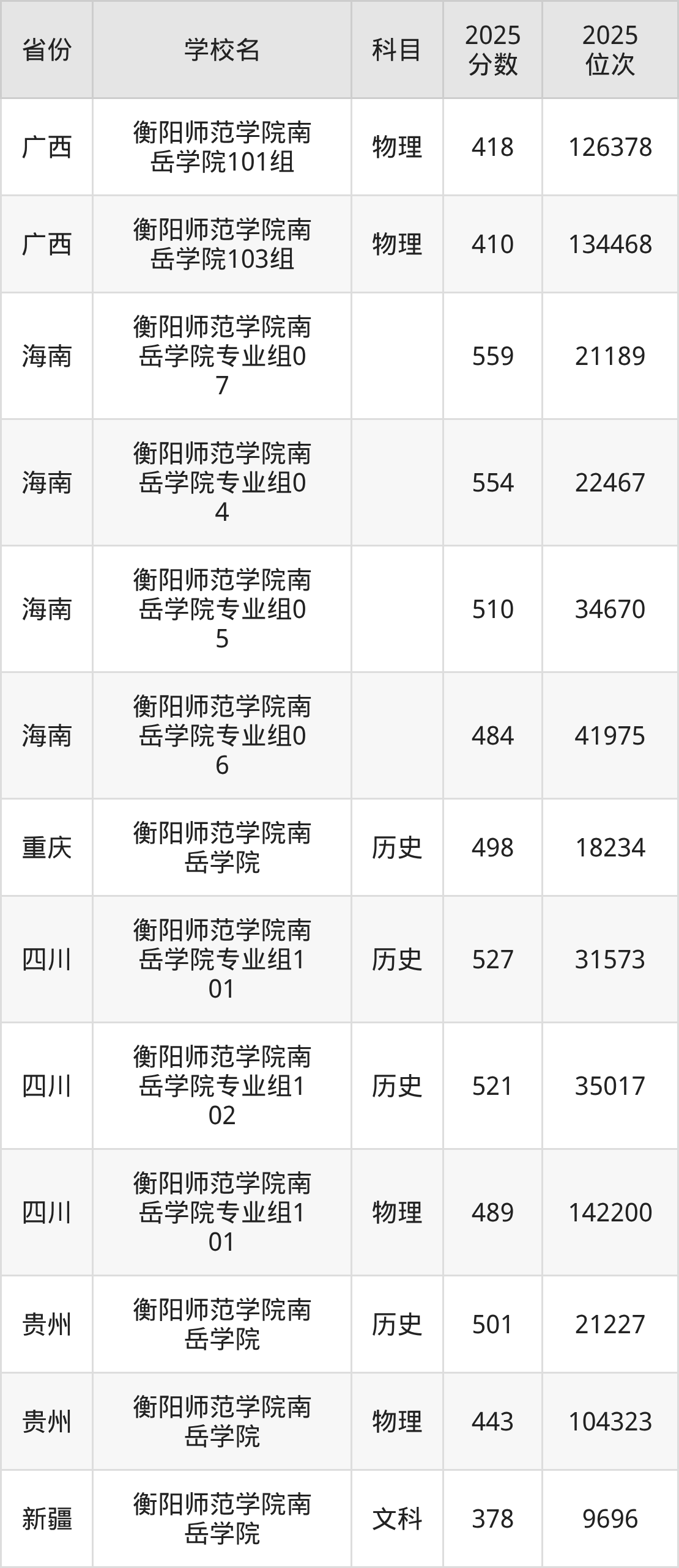 2025年衡阳师范学院南岳学院在省外录取分数线范围整体位于378分到559分之间,录取分数线最低在新疆文科、录取分数线最高在海南(专业组07)。