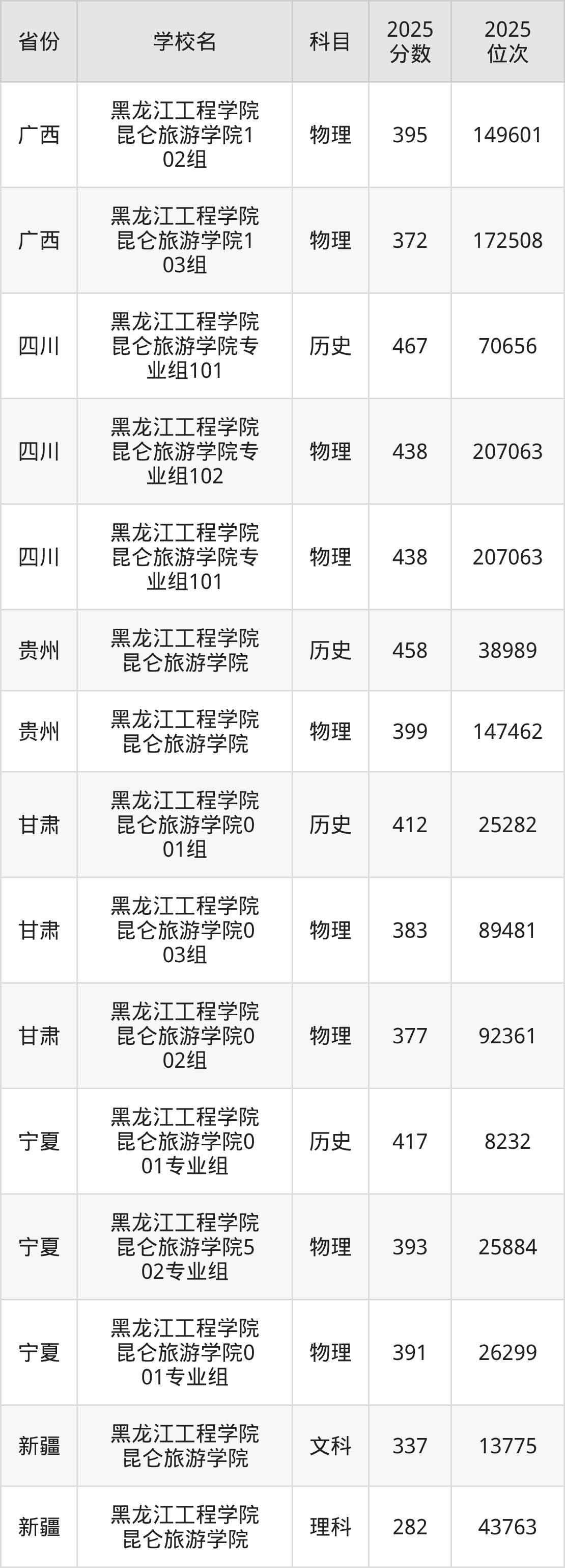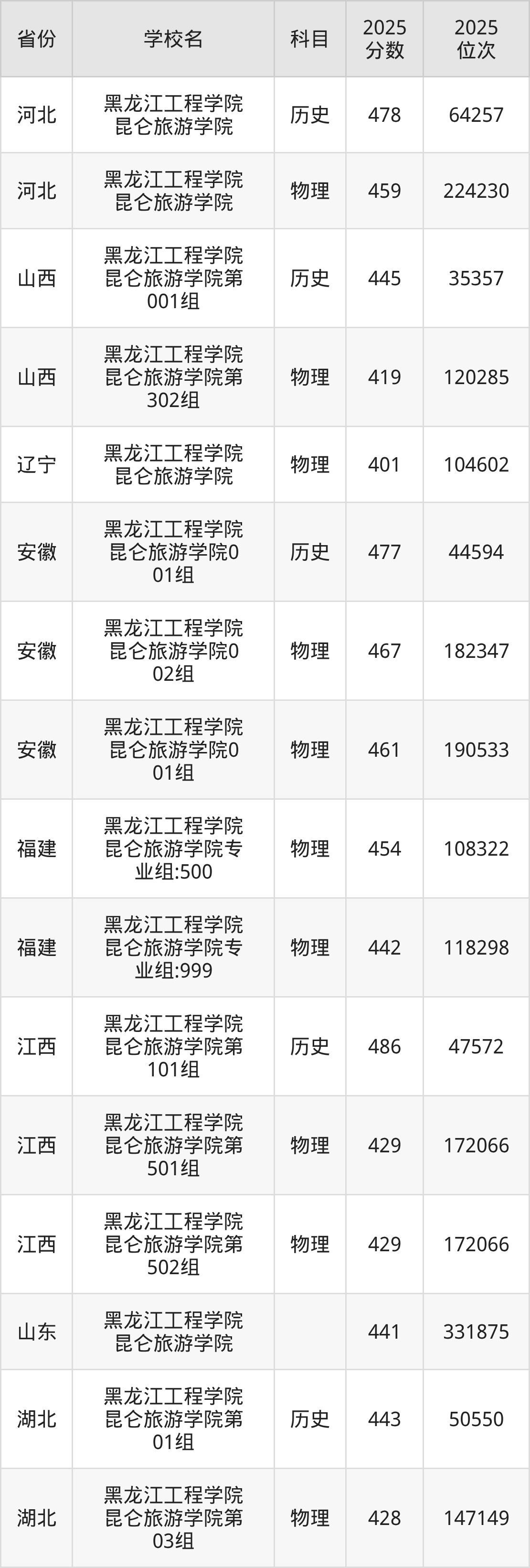 下面是黑龙江工程学院昆仑旅游学院2025年录取分数线各省汇总,一起来了解下吧。