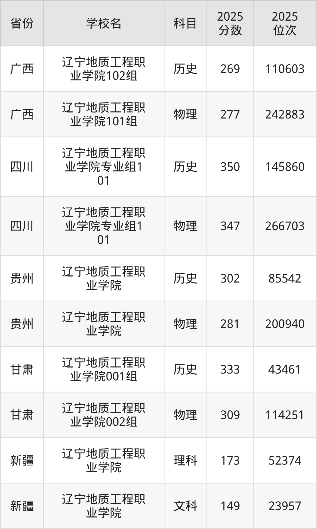 2026年辽宁地质工程职业学院录取分数线预计在310分及以上,在各省录取最低分存在一定差异,如:2025年辽宁地质工程职业学院在广西录取最低历史类269分、物理类277分,在新疆录取最低文科149分、理科173分,在吉林录取最低历史类342分、物理类320分。