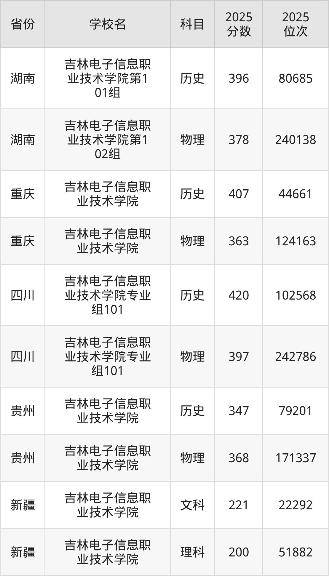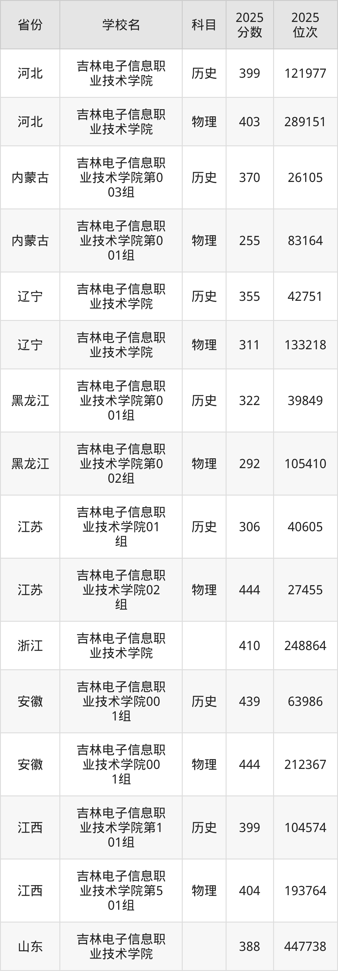 2025年吉林电子信息职业技术学院历史类最低分320分(26733名)、物理类最低分299分(75022名)。