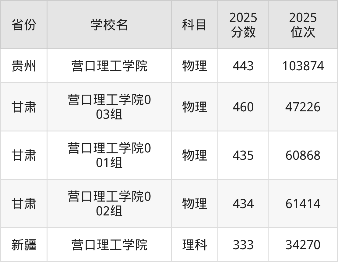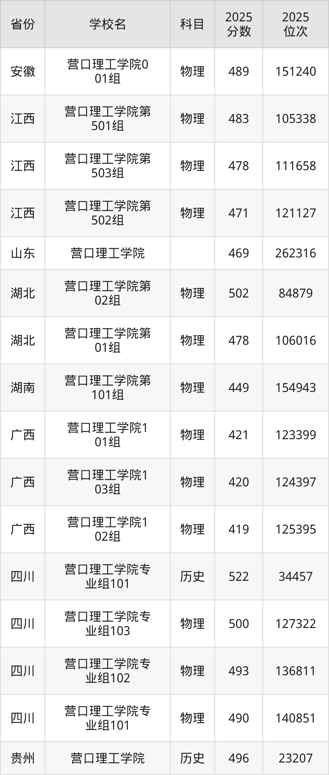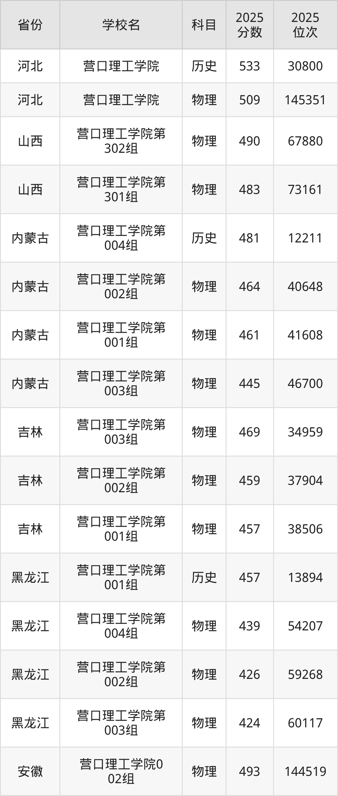 2025年营口理工学院历史类最低分476分(19290名)、物理类最低分464分(74699名)。