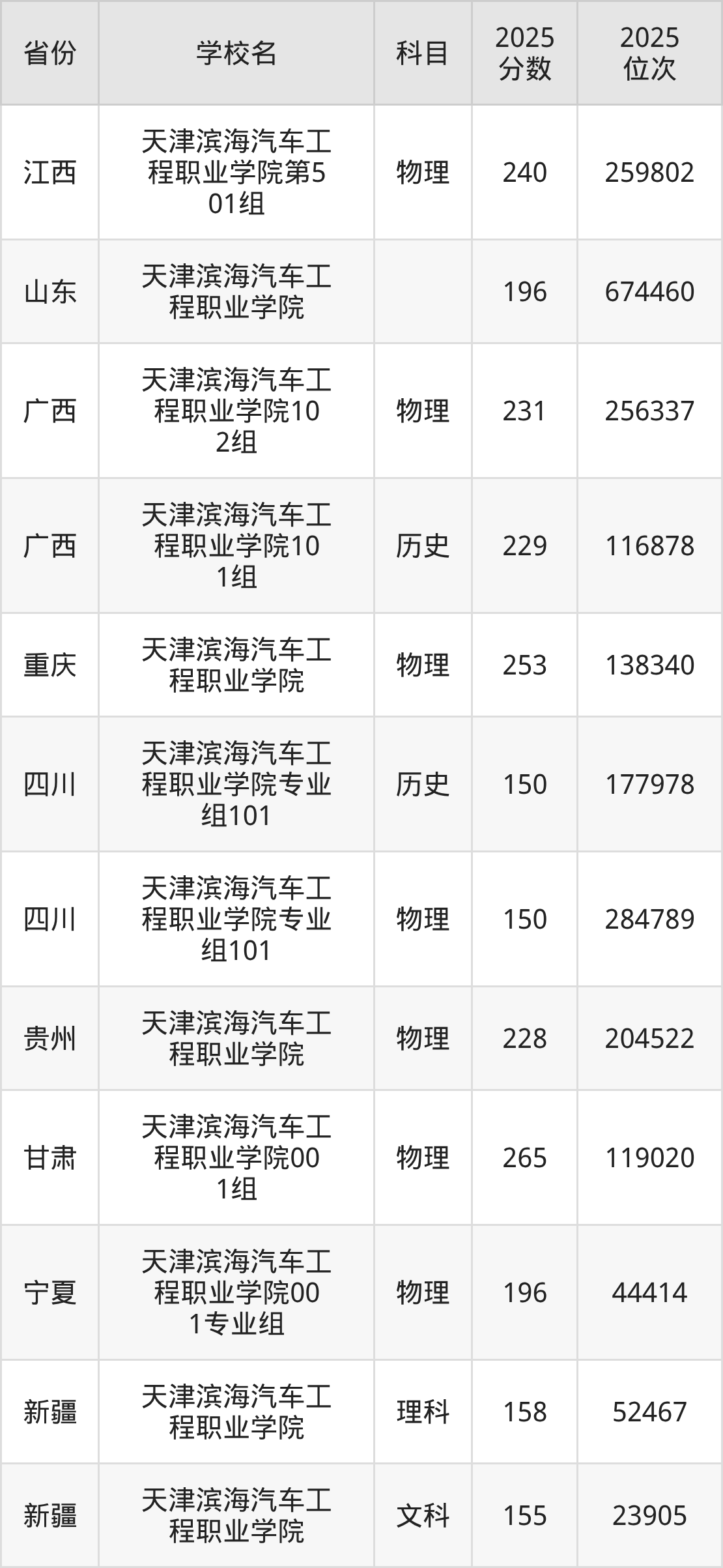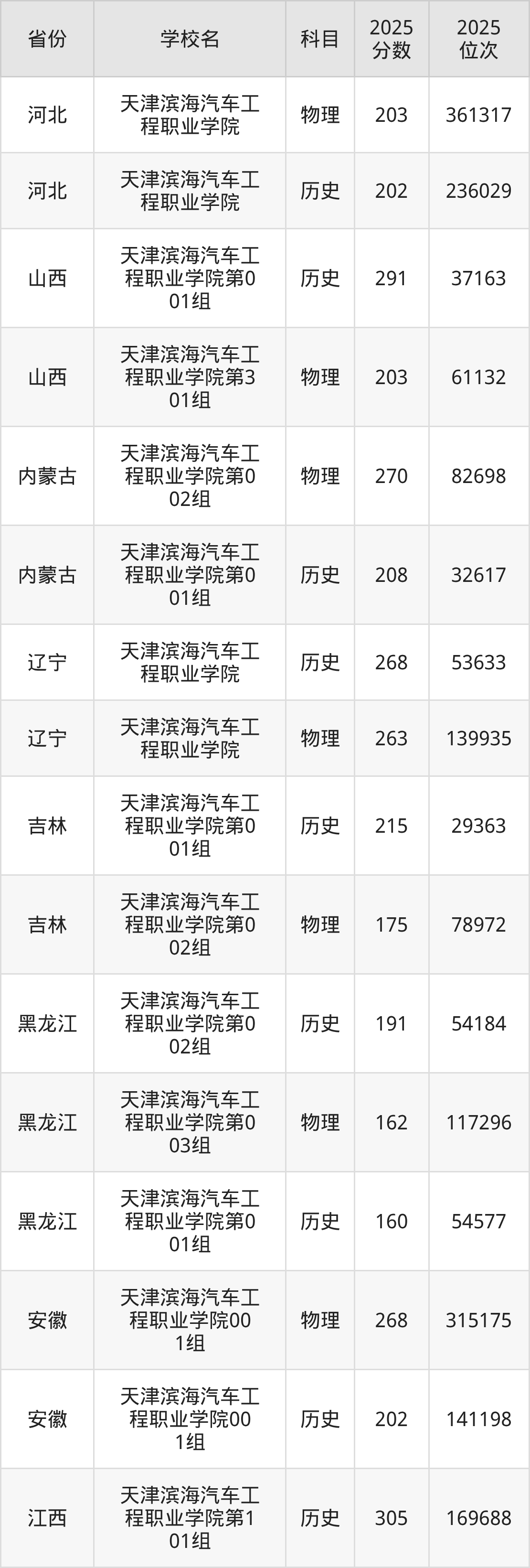 下面是天津滨海汽车工程职业学院2025年录取分数线各省汇总,一起来了解下吧。