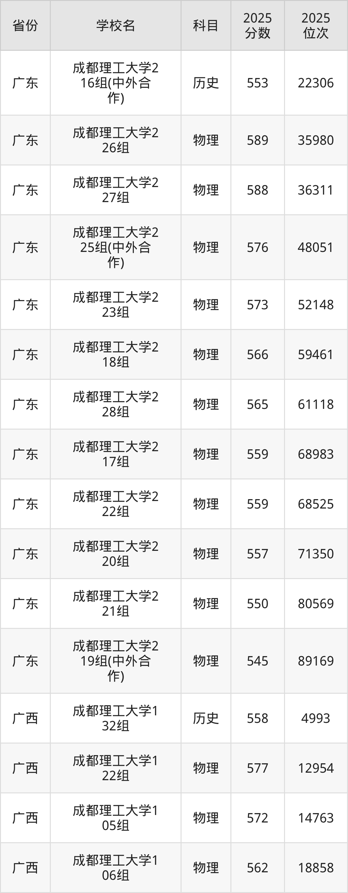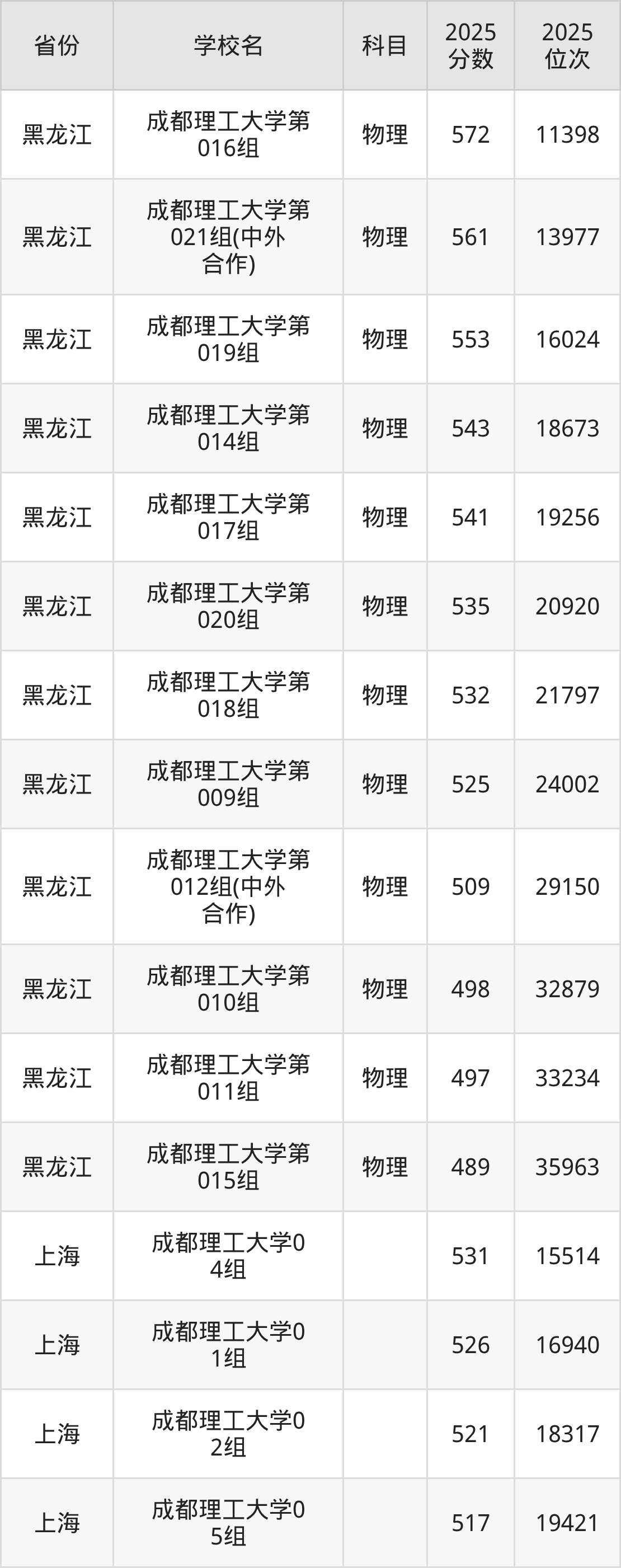 | 成都理工大学专 业组118(中 外合作) | 物理 | 547 | 68733 |