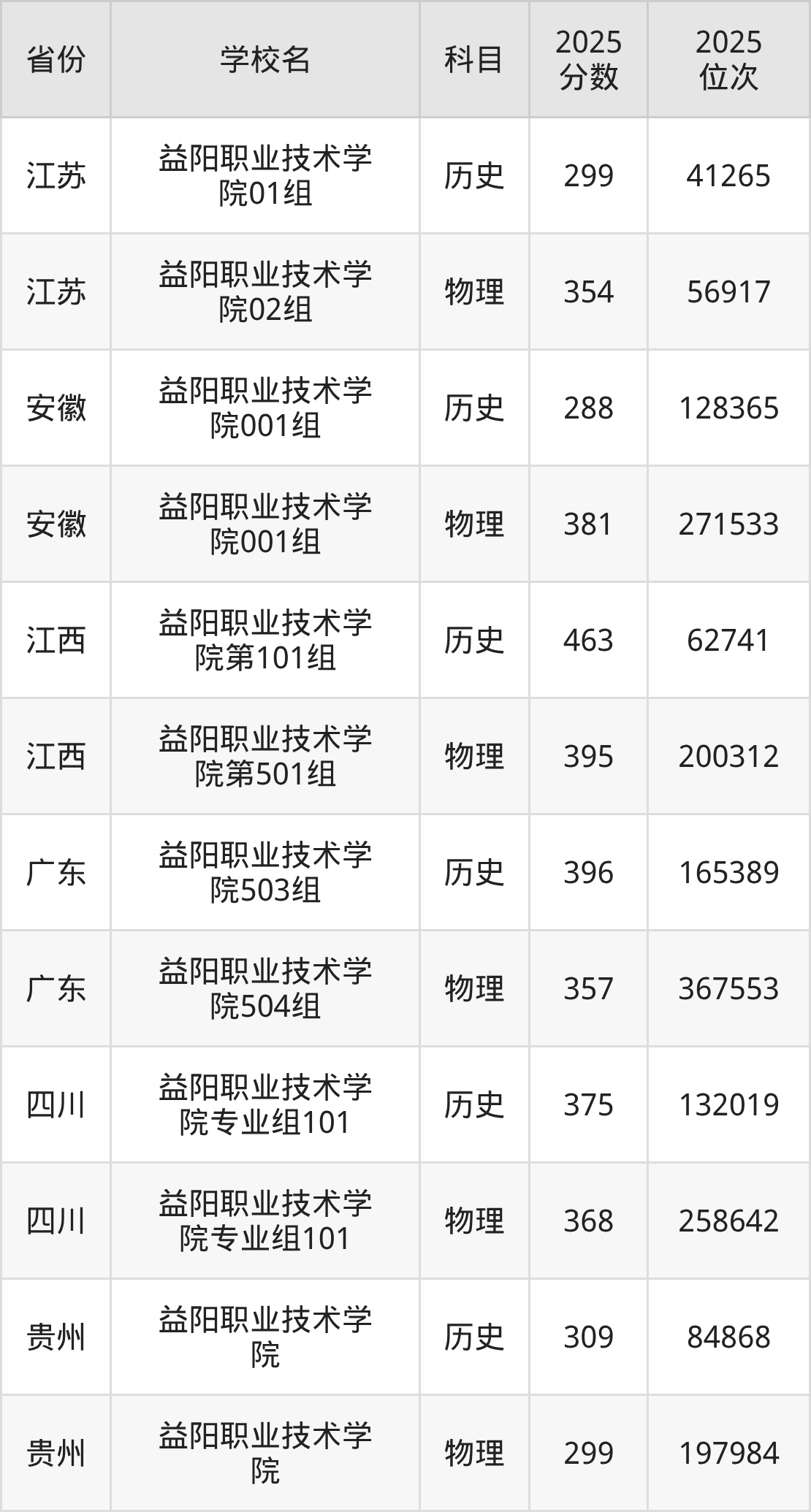 2025年益阳职业技术学院历史类最低分343分(108395名)、物理类最低分338分(272651名)。