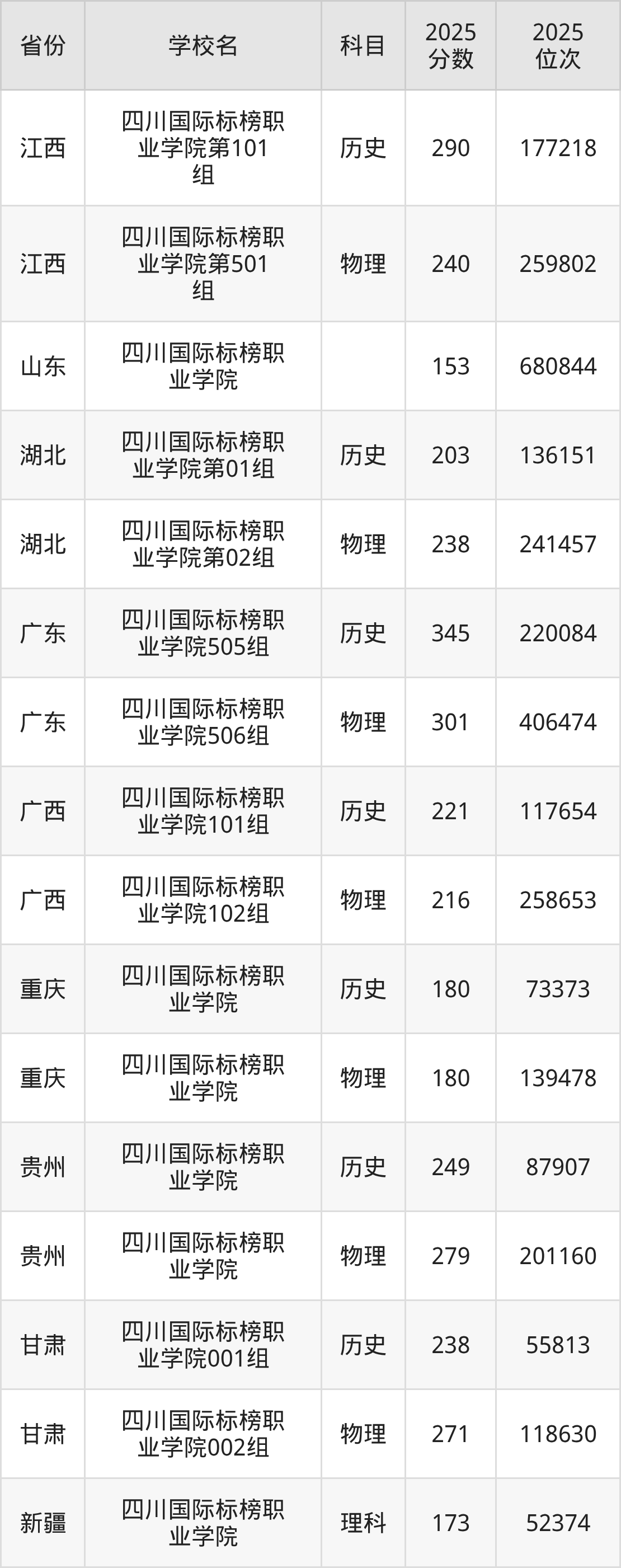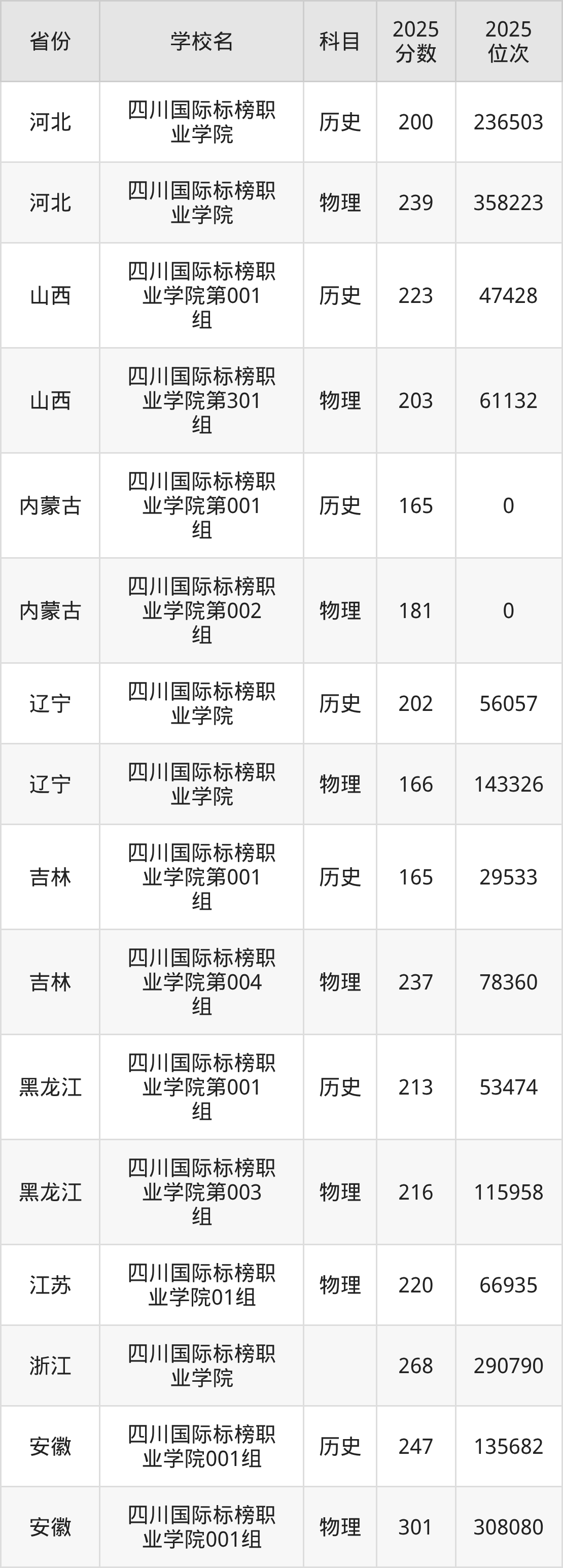 2025年四川国际标榜职业学院在省内分历史物理科目类录取,其中历史类最低分是150分、对应位次是177978名;物理类最低分是150分,对应位次是284789名。