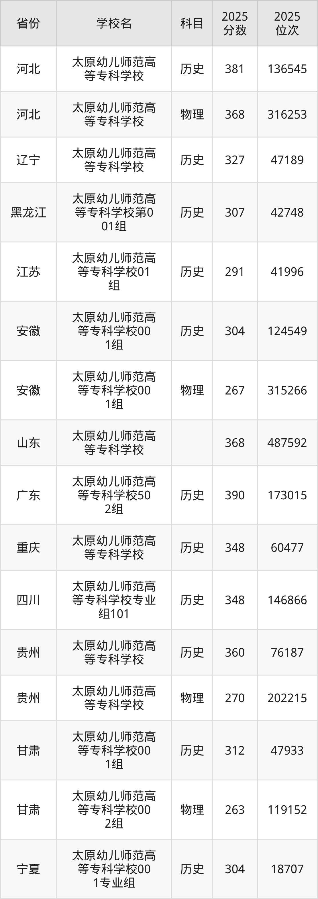 下面是太原幼儿师范高等专科学校2025年录取分数线各省汇总,一起来了解下吧。