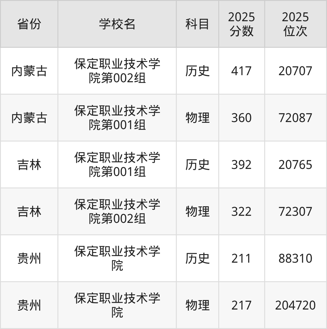 | 保定职业技术学 院 | 历史 | 376 | 140681 |