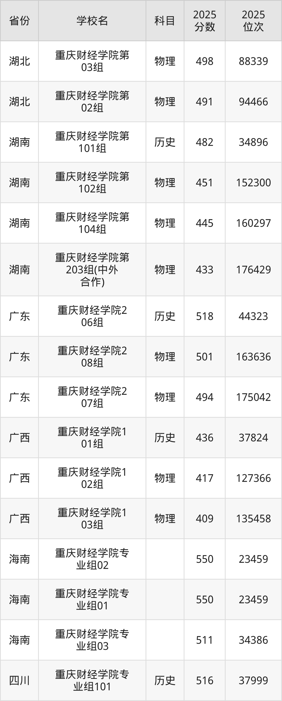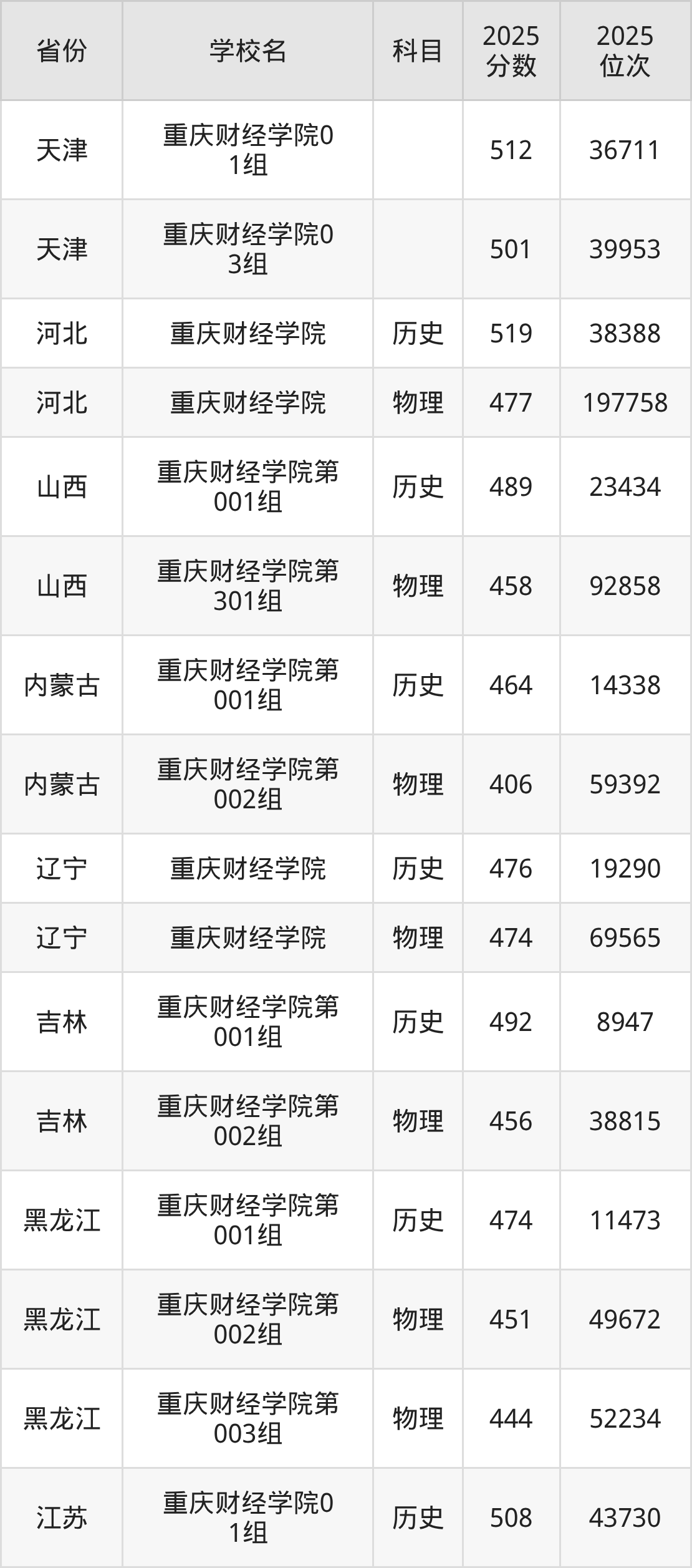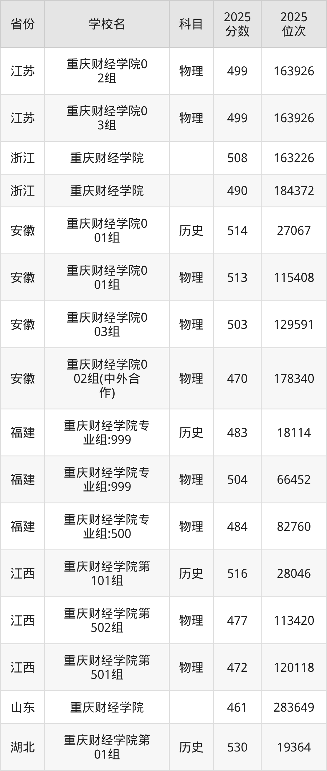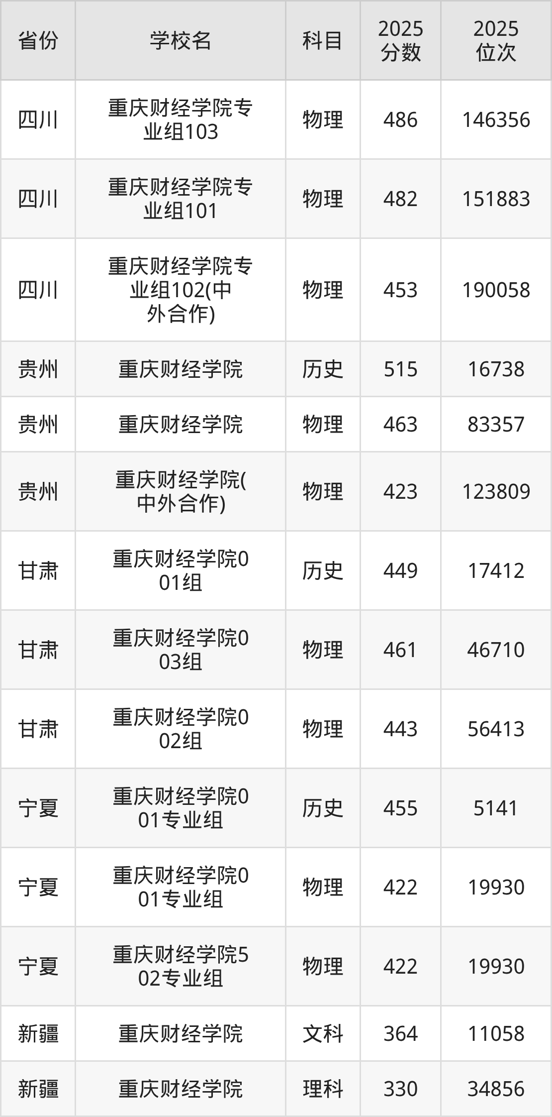 2025年重庆财经学院历史类最低分465分(27281名)、物理类最低分425分(103219名)。