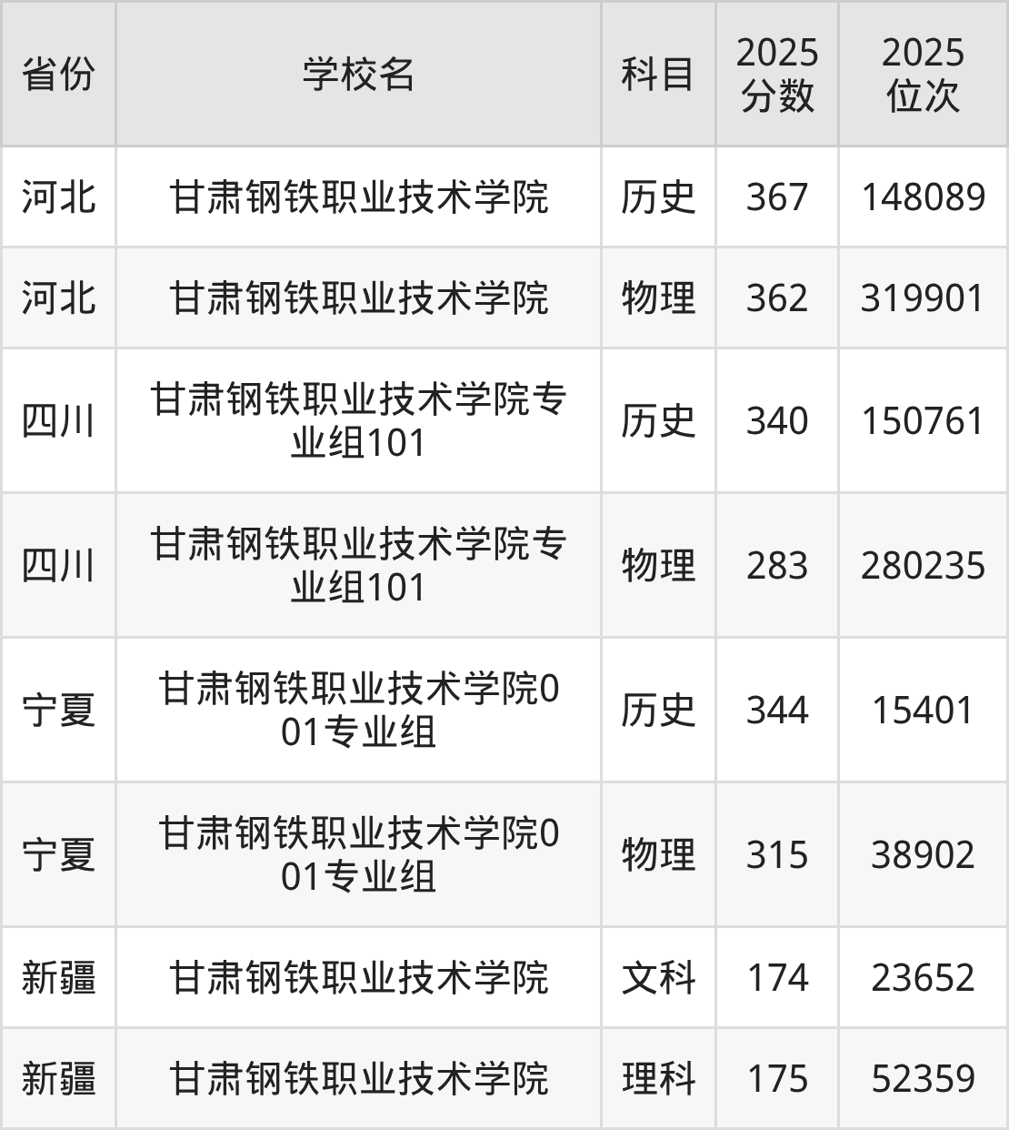 2025年甘肃钢铁职业技术学院历史类最低分210分(56596名)、物理类最低分191分(120658名)。