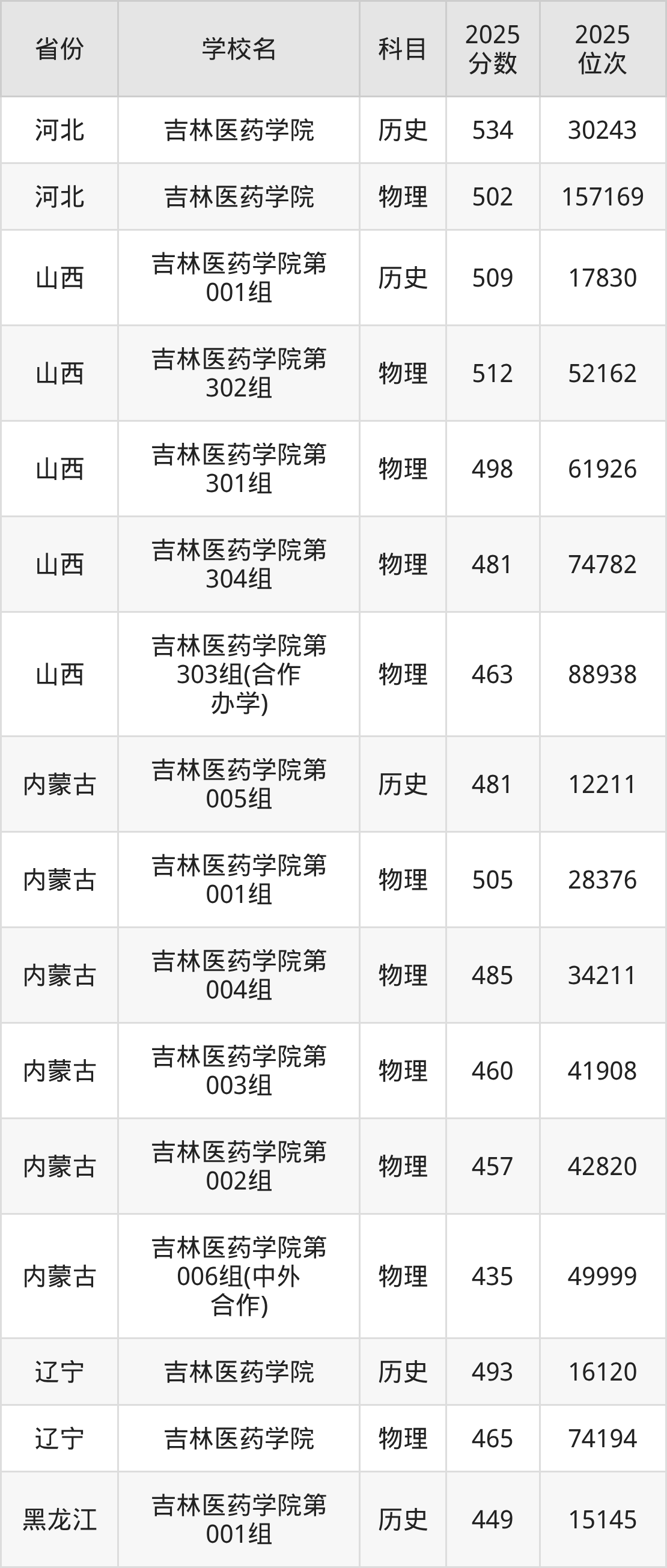 2025年吉林医药学院在省内分历史物理科目类录取,其中历史类最低分是470分、对应位次是11493名;物理类最低分是410分,对应位次是52624名。