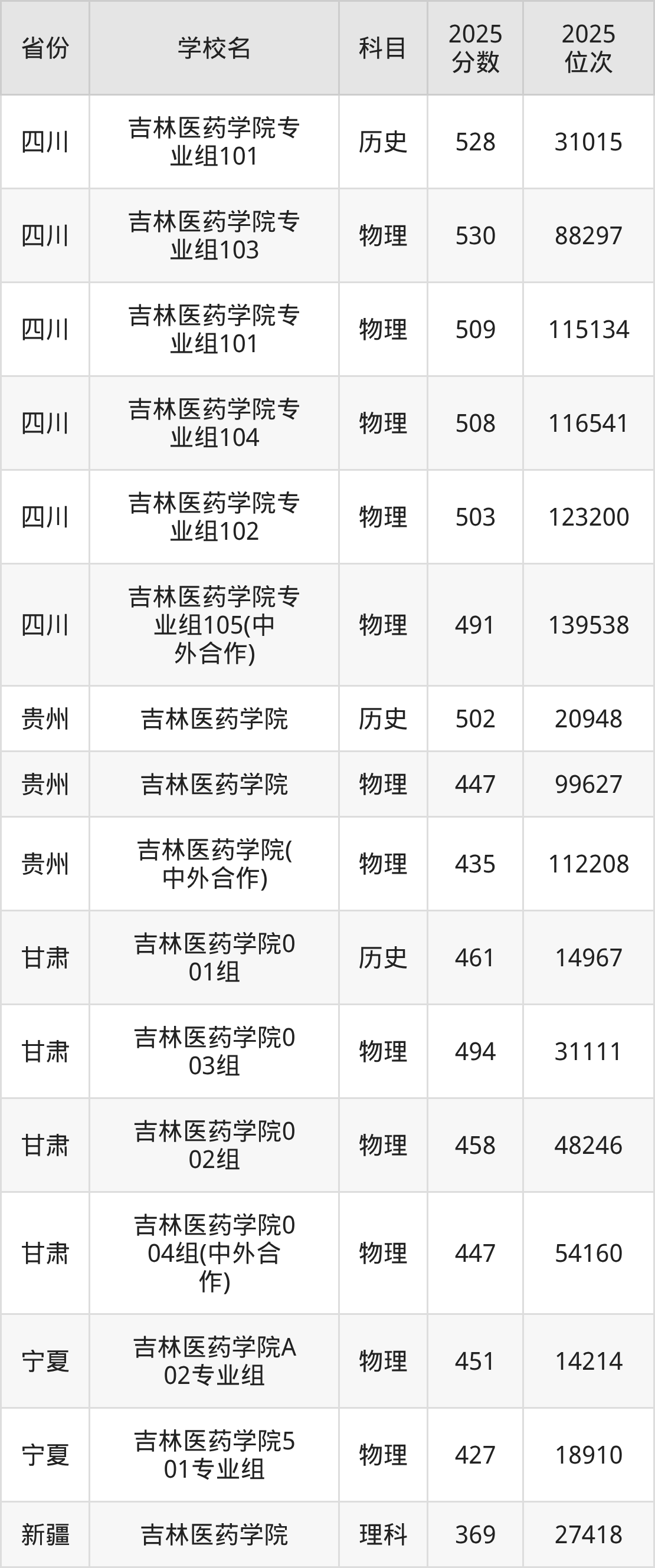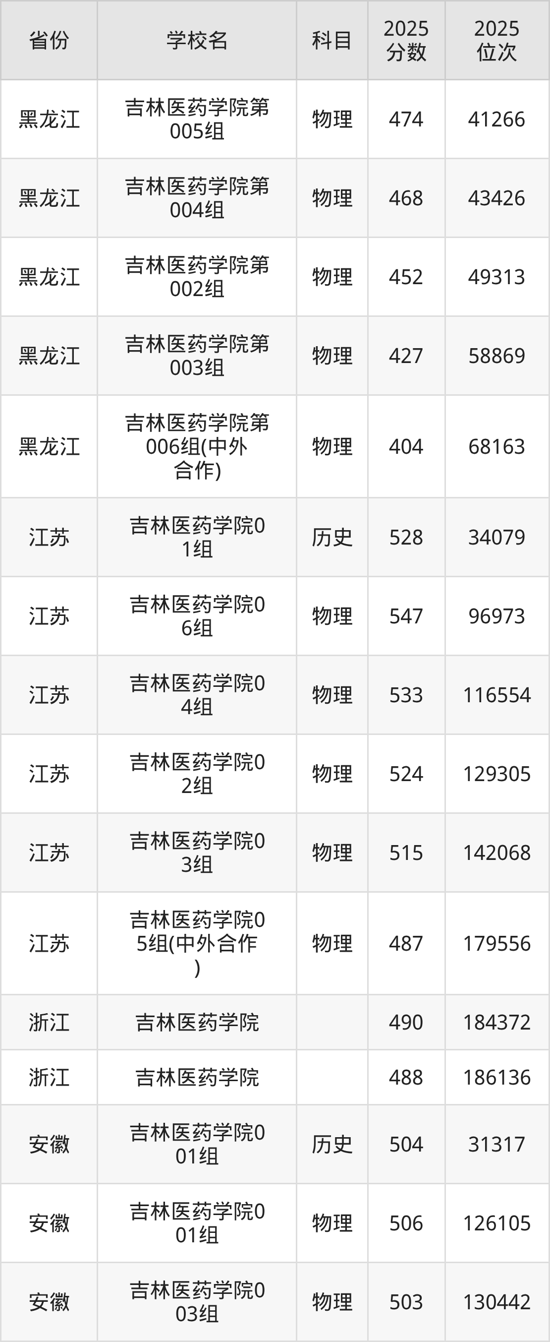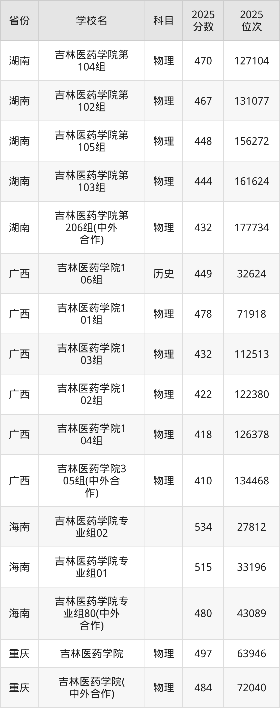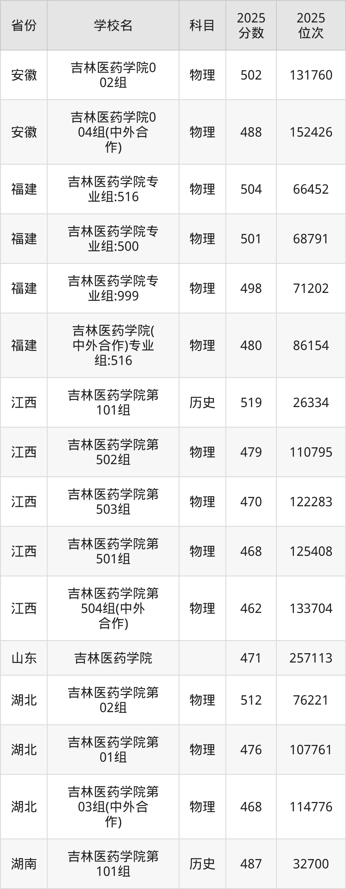 2025年吉林医药学院历史类最低分470分(11493名)、物理类最低分410分(52624名)。