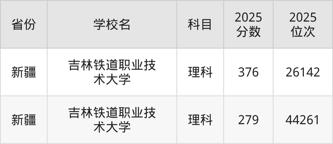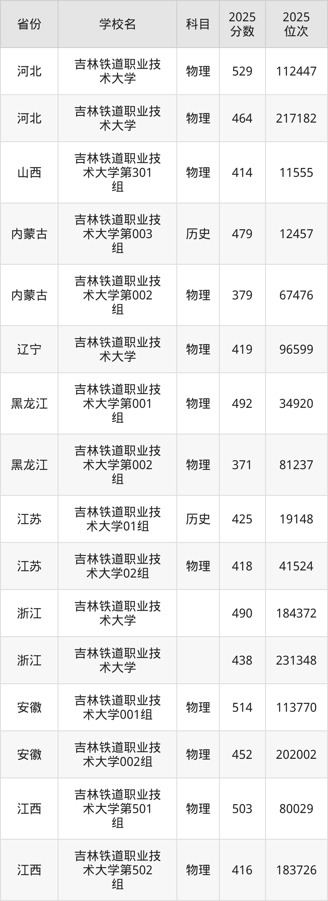 2025年吉林铁道职业技术大学历史类最低分400分(19929名)、物理类最低分324分(72048名)。