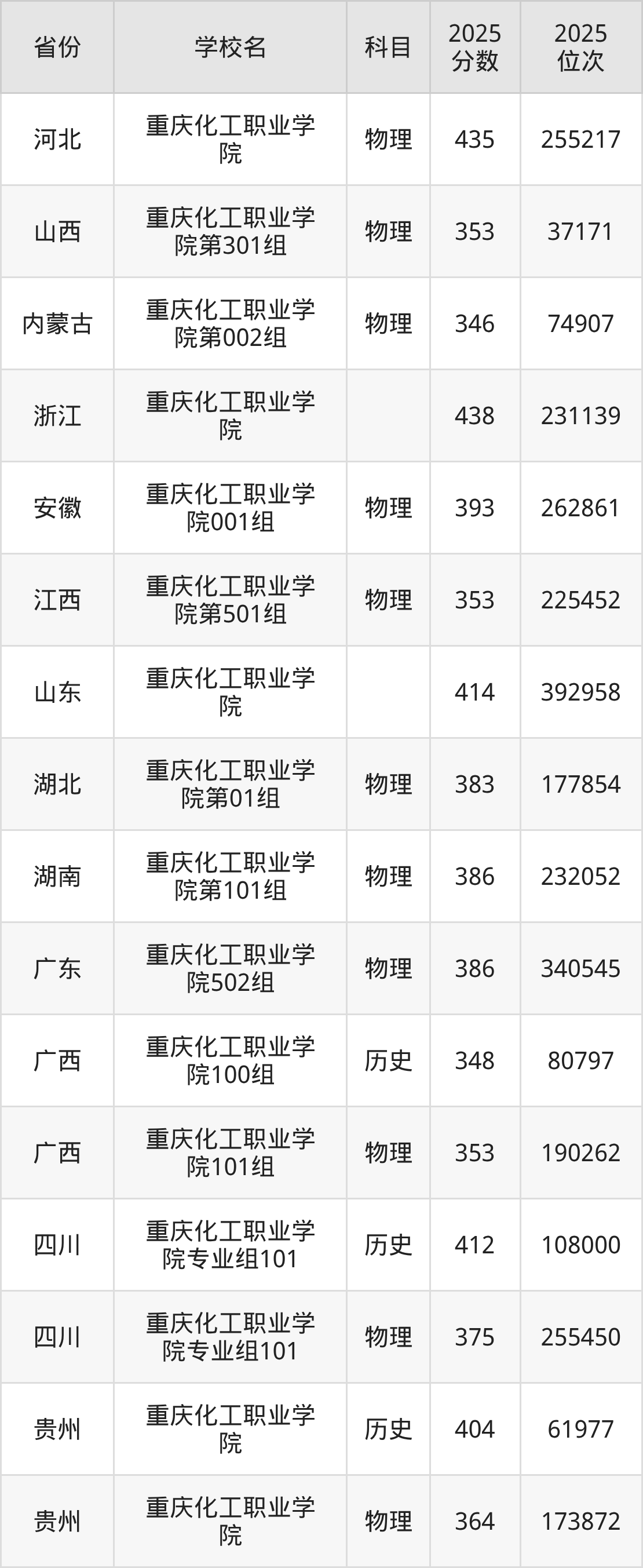| 重庆化工职业学 院 | 物理 | 357 | 125534 |