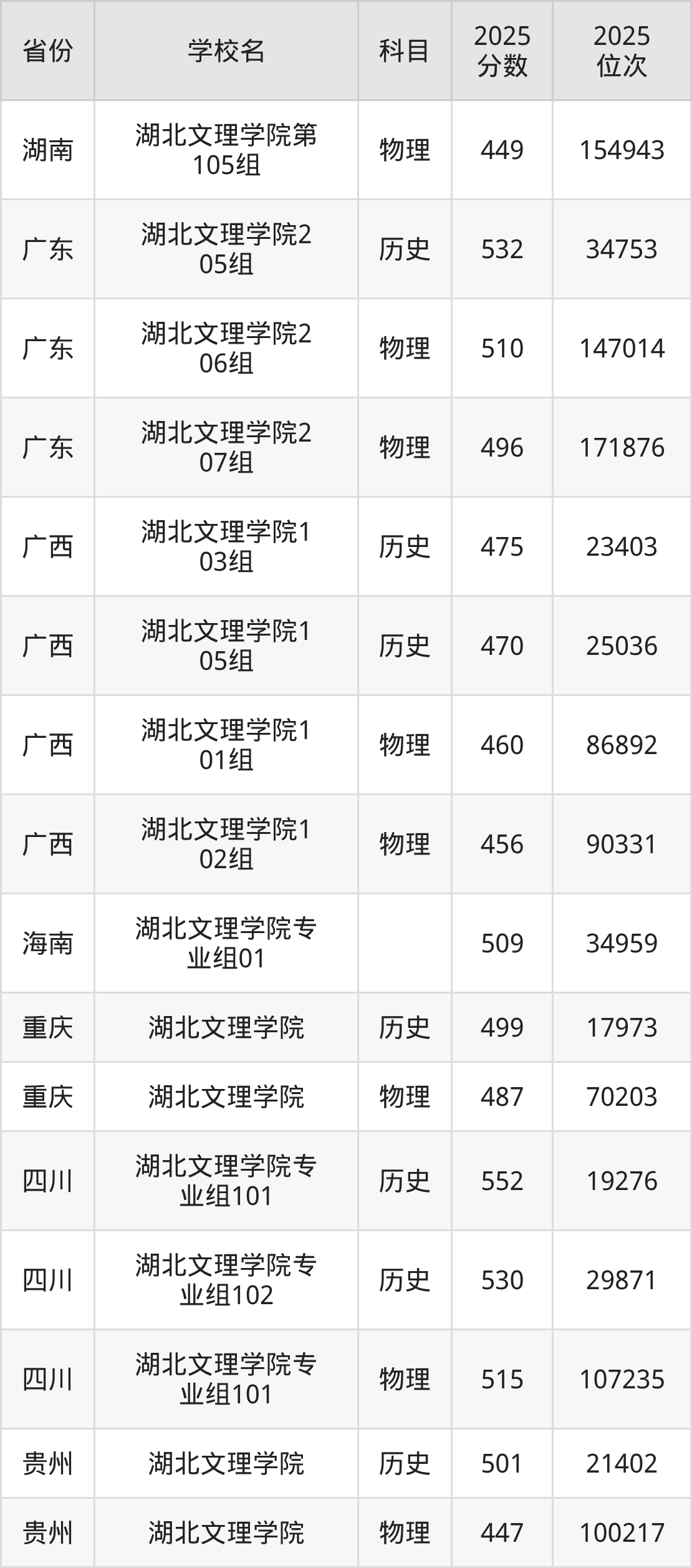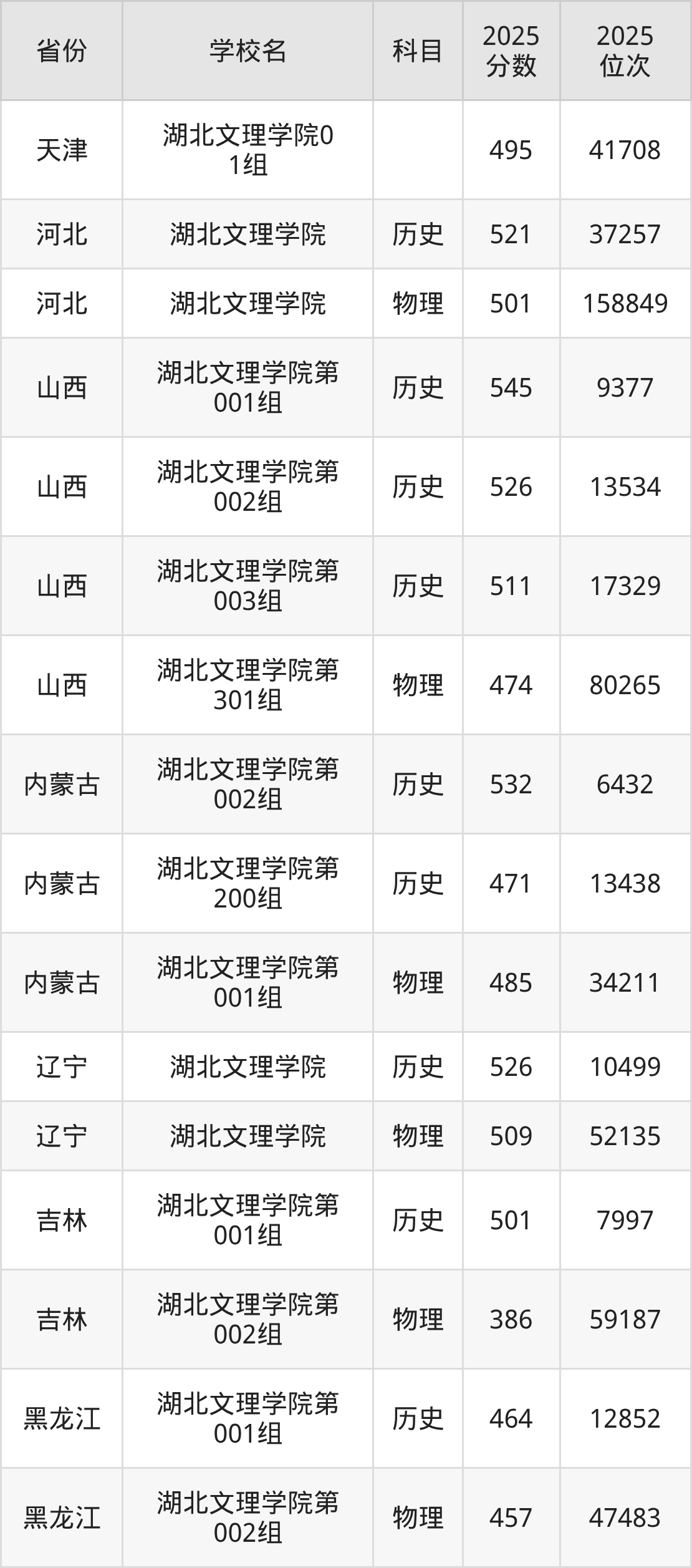 2025年湖北文理学院在省内分历史物理科目类录取,其中历史类最低分是511分、对应位次是25200名;物理类最低分是485分,对应位次是99808名。