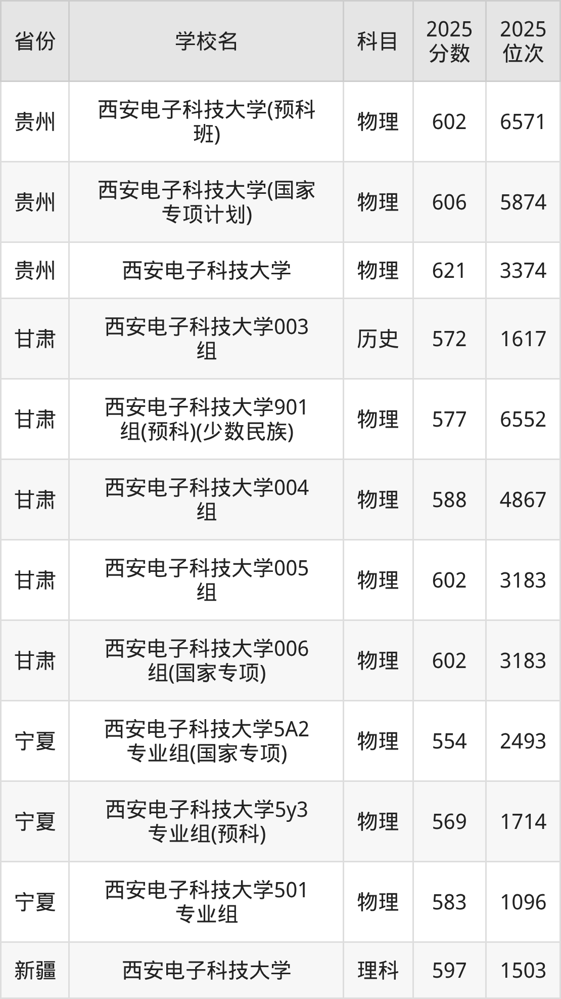 2025年西安电子科技大学在省外录取分数线范围整体位于554分到722分之间,录取分数线最低在宁夏物理(5A2专业组(国家专项))、录取分数线最高在海南(专业组03)。