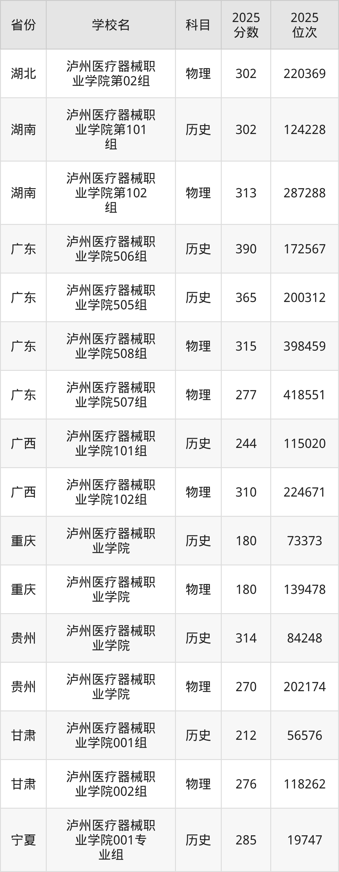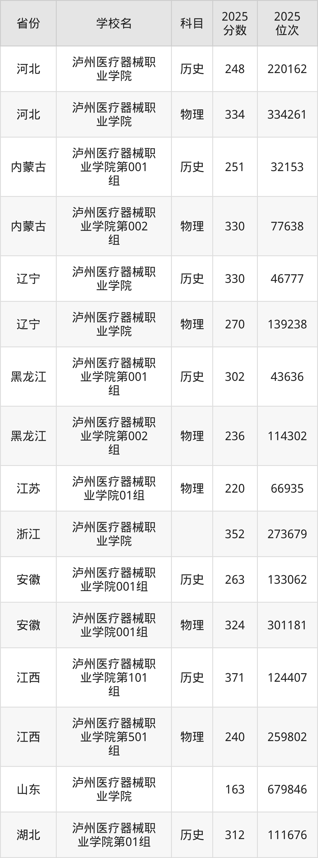 2025年泸州医疗器械职业学院在省内分历史物理科目类录取,其中历史类最低分是150分、对应位次是177978名;物理类最低分是150分,对应位次是284789名。