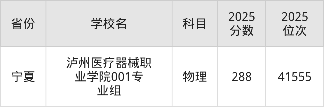| 泸州医疗器械职 业学院专业组1 01 | 物理 | 150 | 284789 |