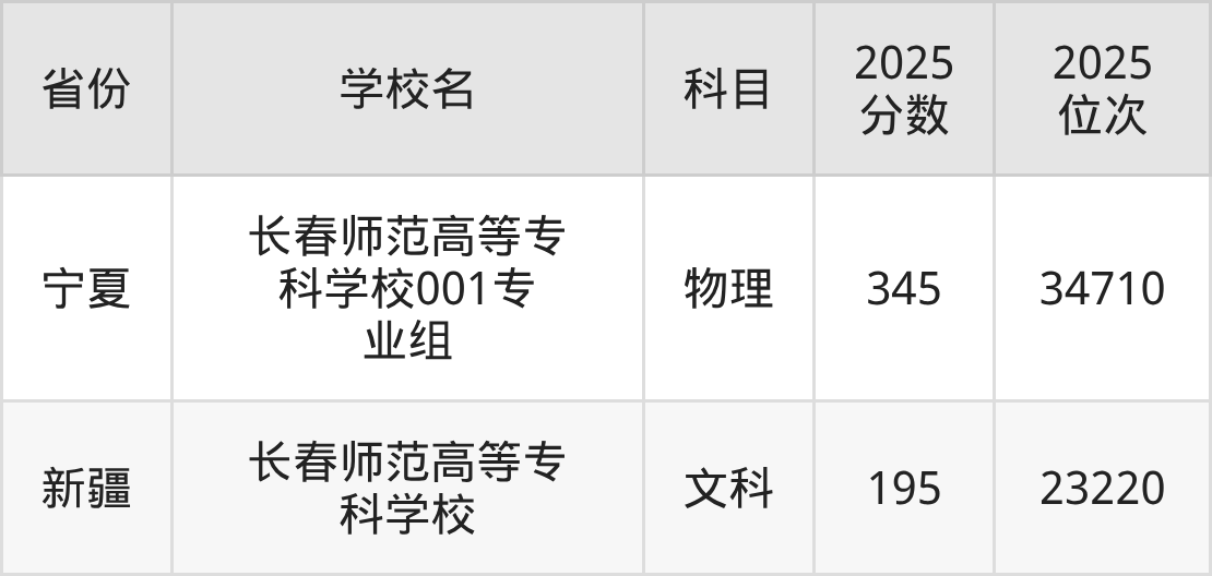 2026年长春师范高等专科学校录取分数线预计在300分及以上,在各省录取最低分存在一定差异,如:2025年长春师范高等专科学校在新疆录取最低文科195分,在广西录取最低历史类346分,在内蒙古录取最低历史类377分、物理类326分。