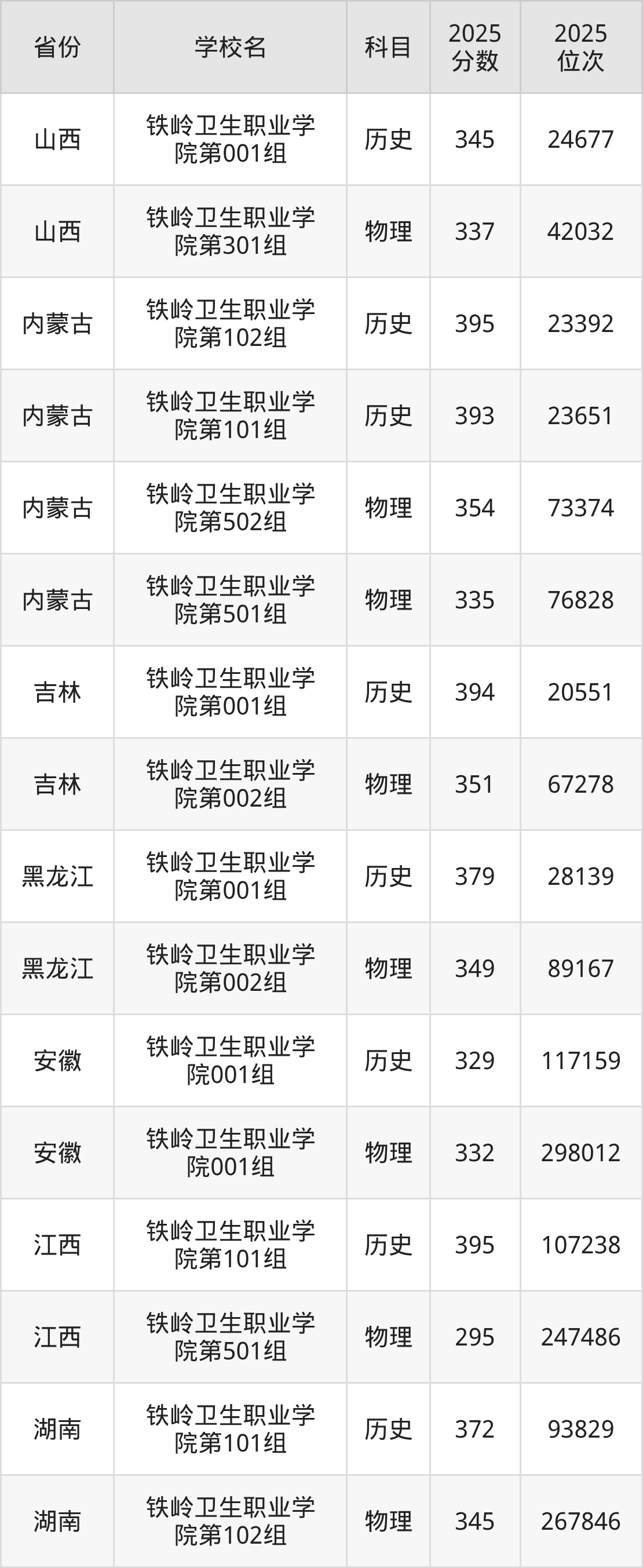 2025年铁岭卫生职业学院历史类最低分335分(46052名)、物理类最低分300分(135097名)。