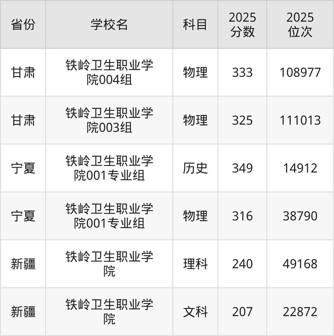 2025年铁岭卫生职业学院在省内分历史物理科目类录取,其中历史类最低分是335分、对应位次是46052名;物理类最低分是300分,对应位次是135097名。