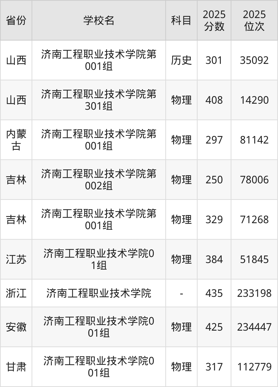 下面是济南工程职业技术学院2025年录取分数线各省汇总,一起来了解下吧。