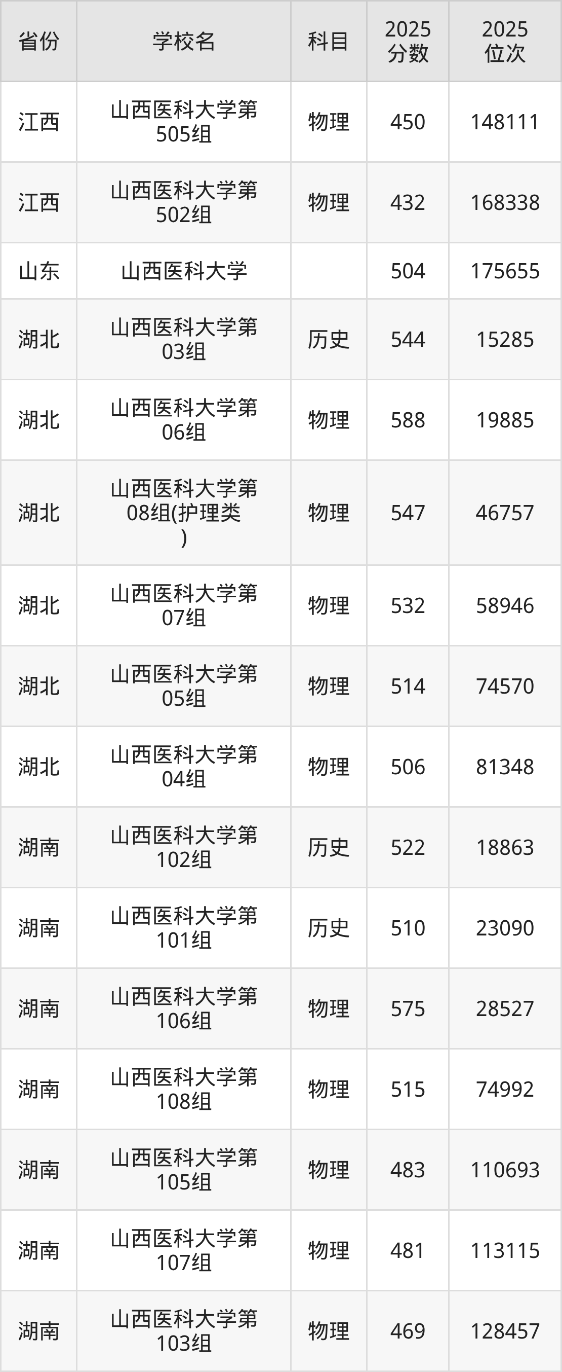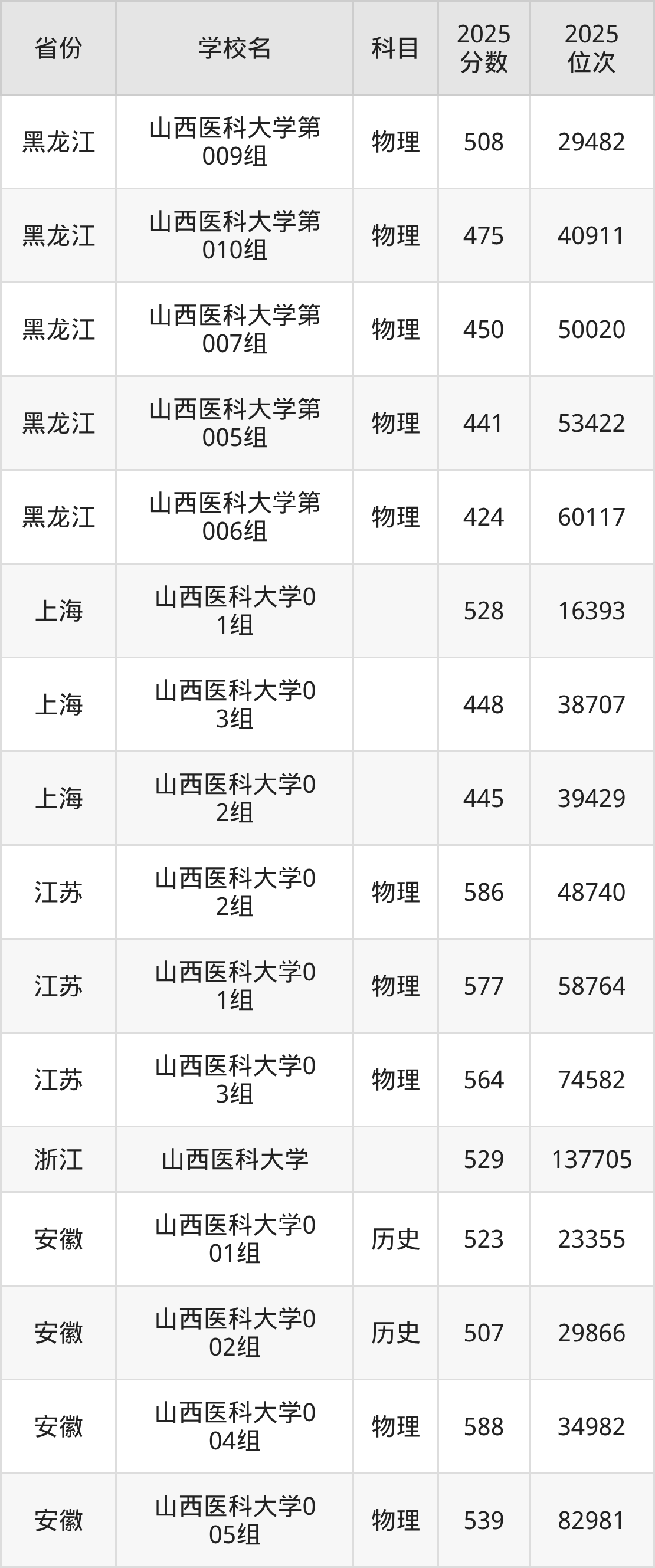 | 山西医科大学第 308组(国家 专项) | 物理 | 503 | 58353 |