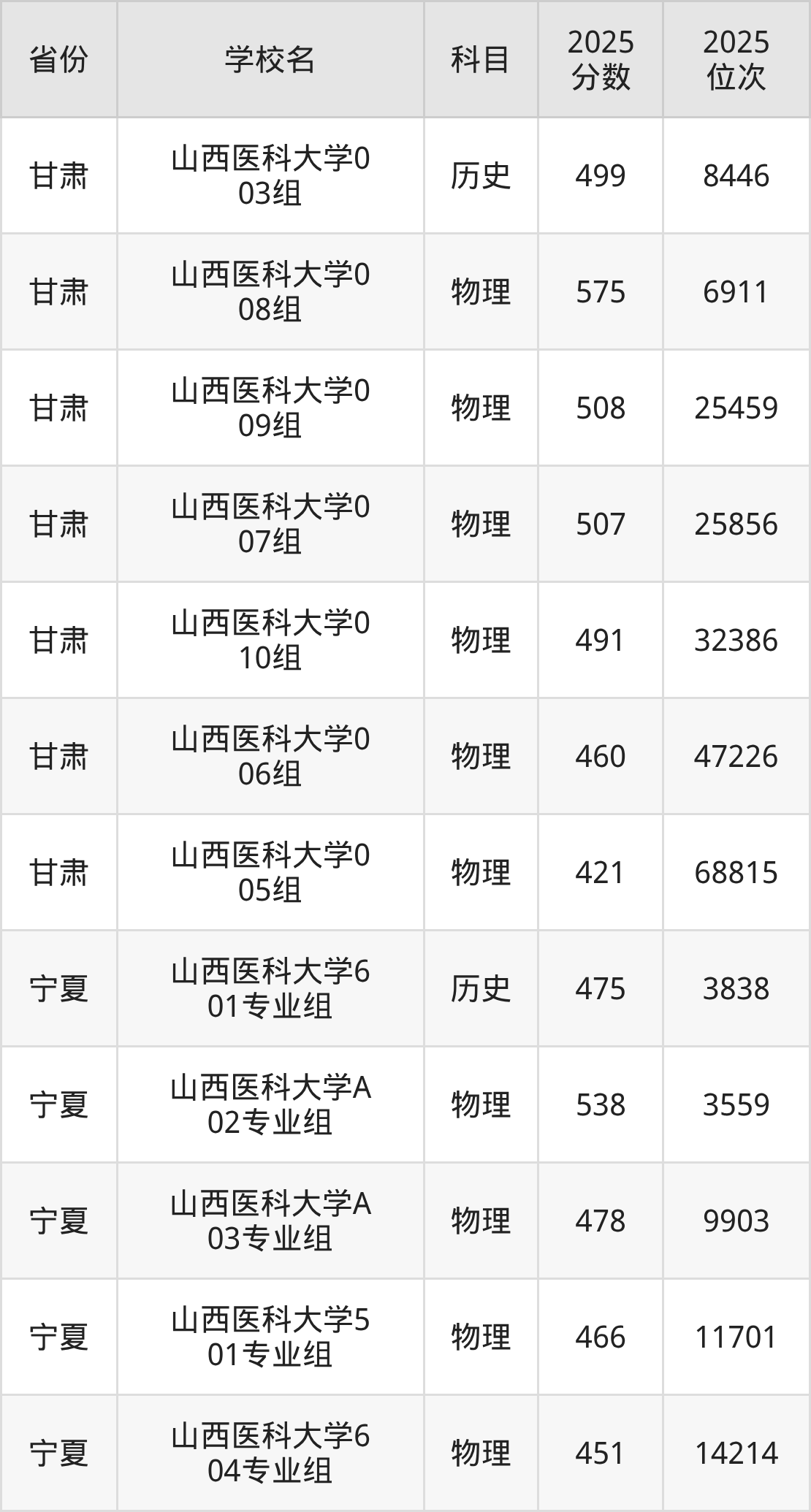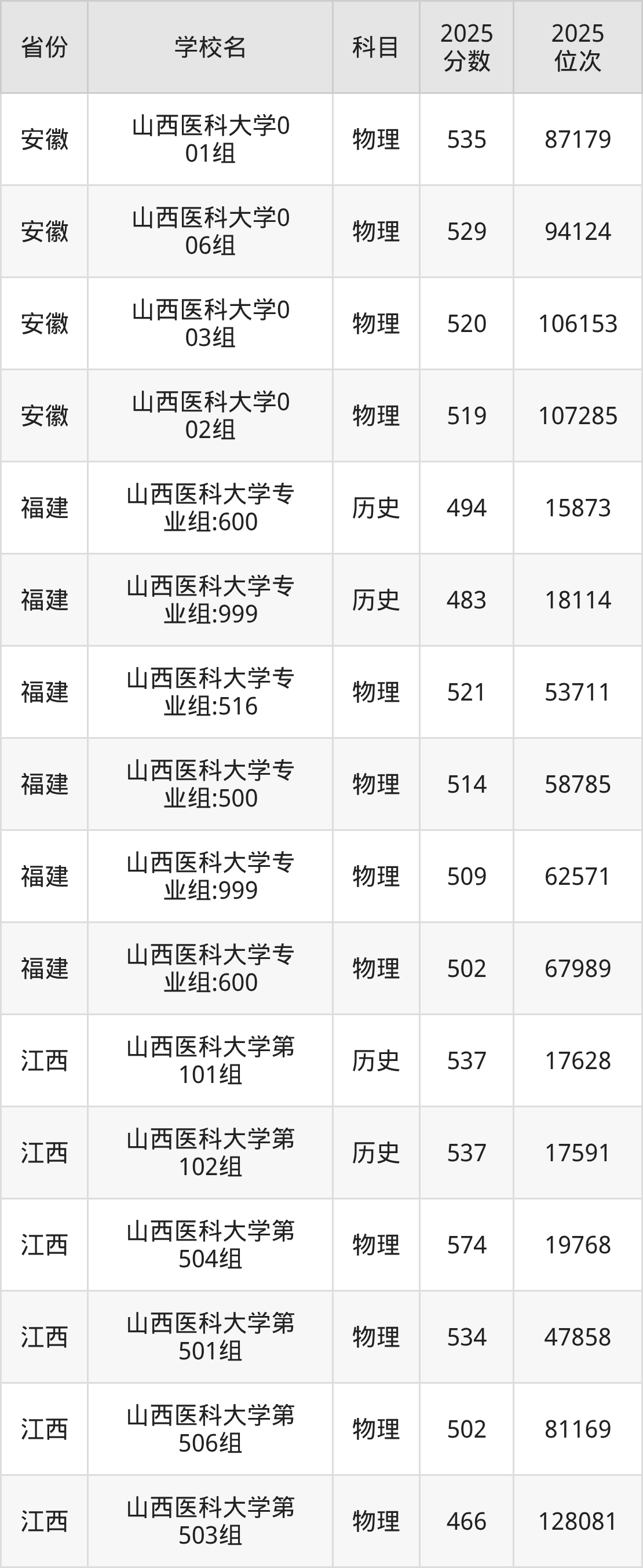 | 山西医科大学第 312组(地方 专项) | 物理 | 499 | 61190 |