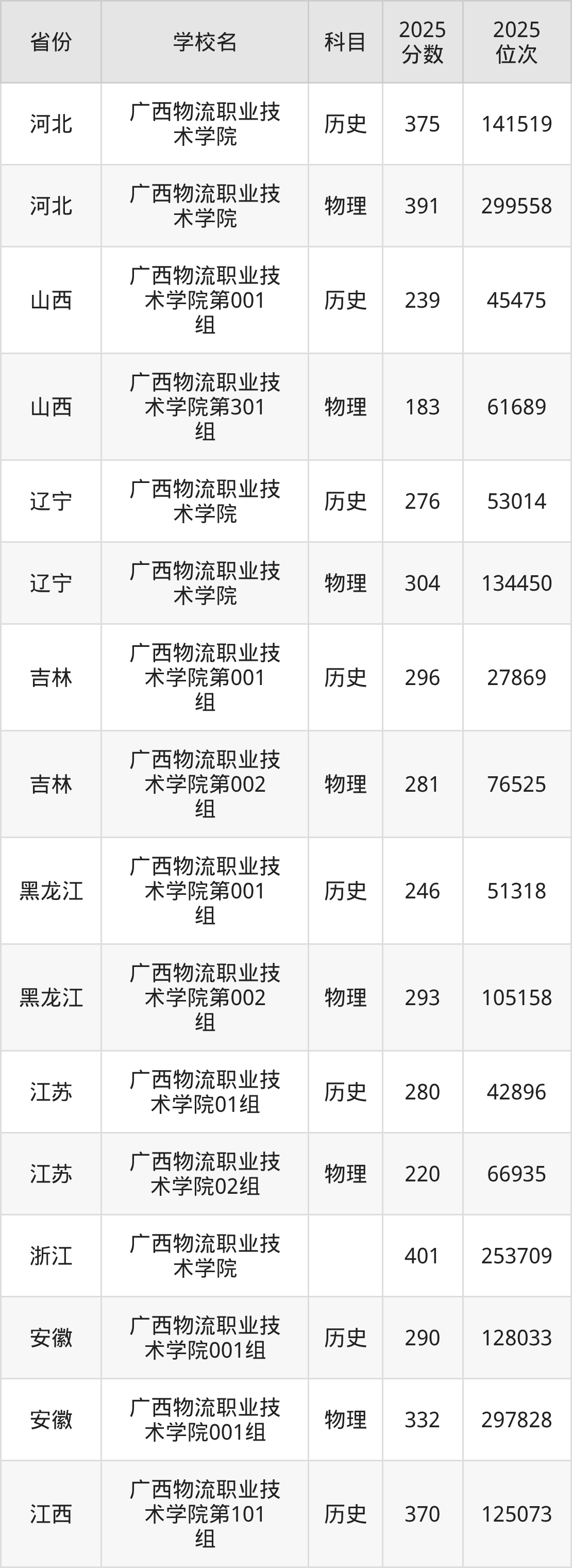 2025年广西物流职业技术学院历史类最低分314分(96851名)、物理类最低分296分(233461名)。