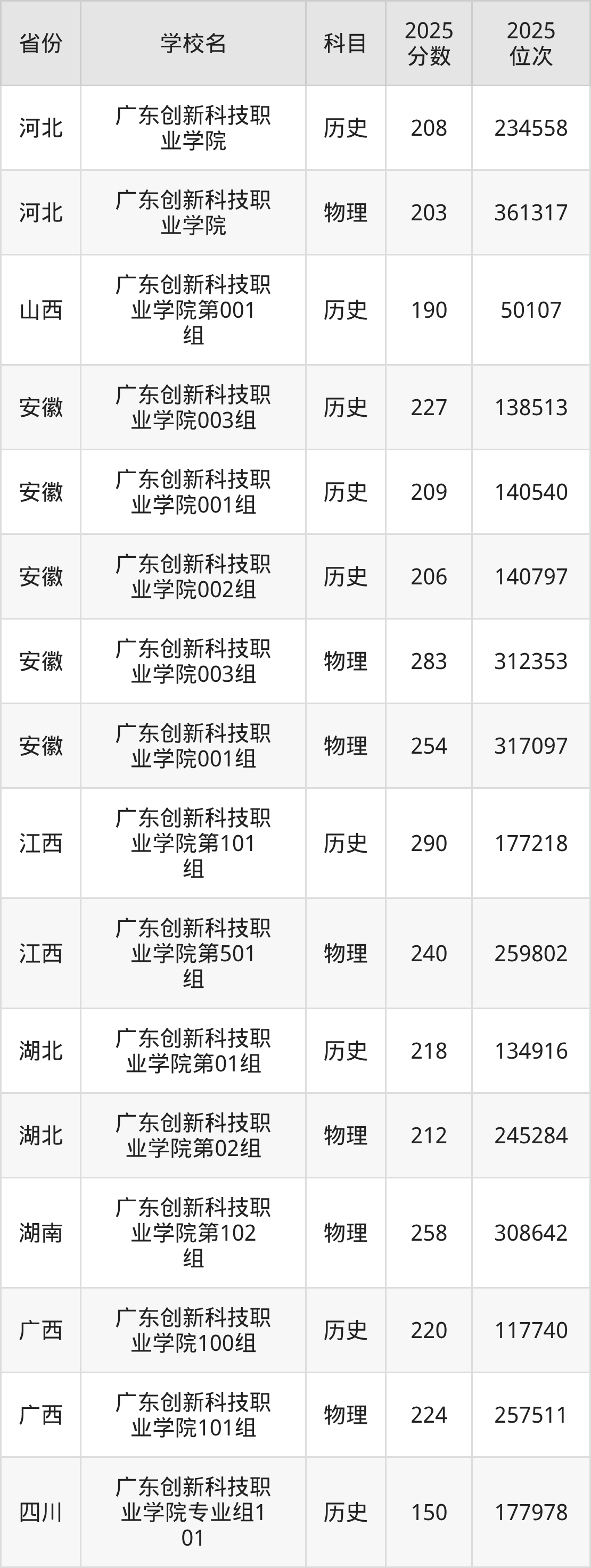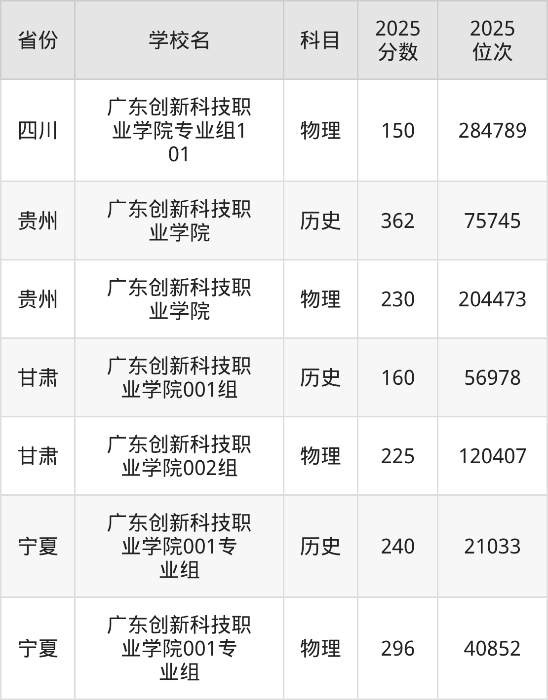 2025年广东创新科技职业学院在省外录取分数线范围整体位于150分到362分之间,录取分数线最低在四川历史(专业组101)、录取分数线最高在贵州历史。
