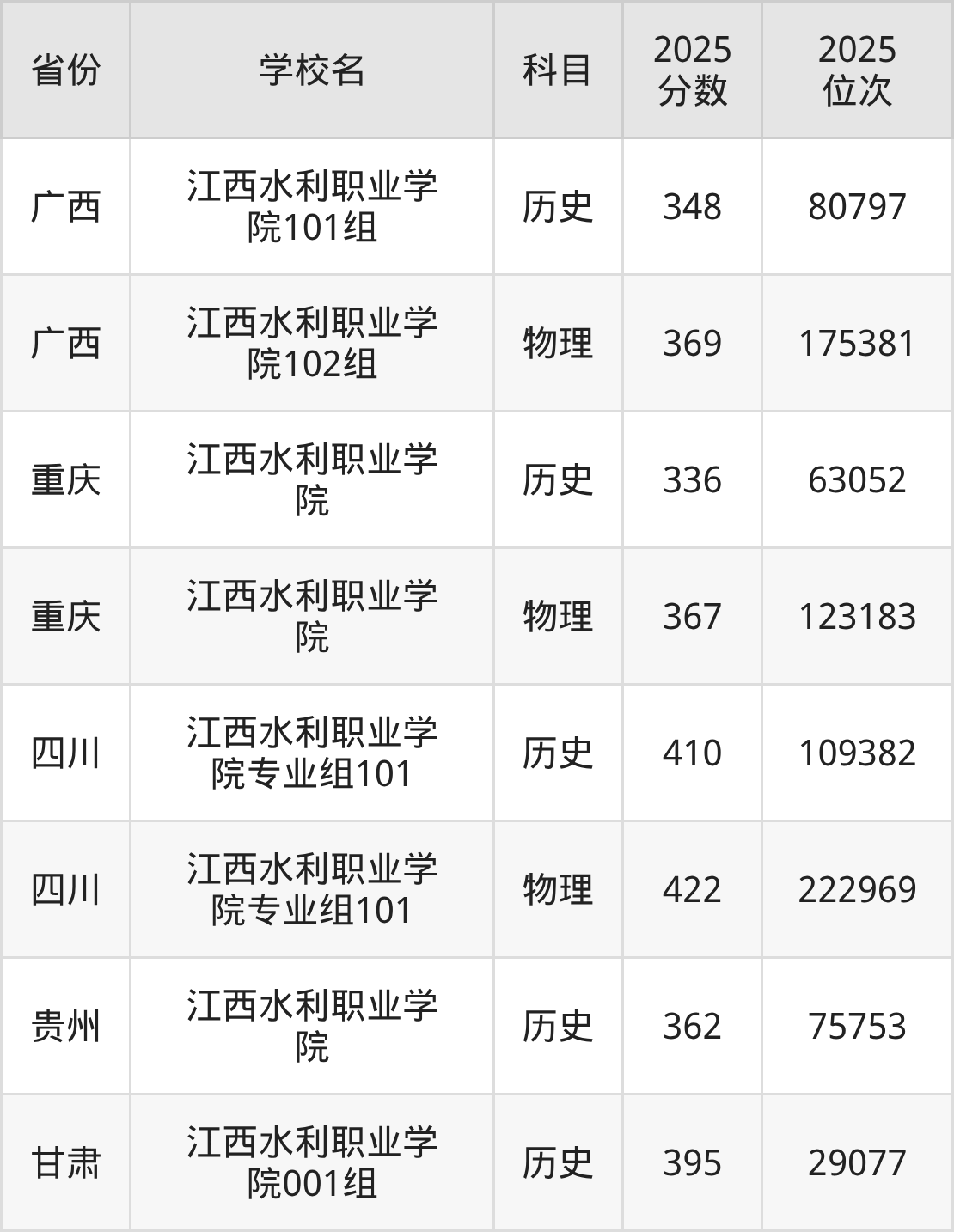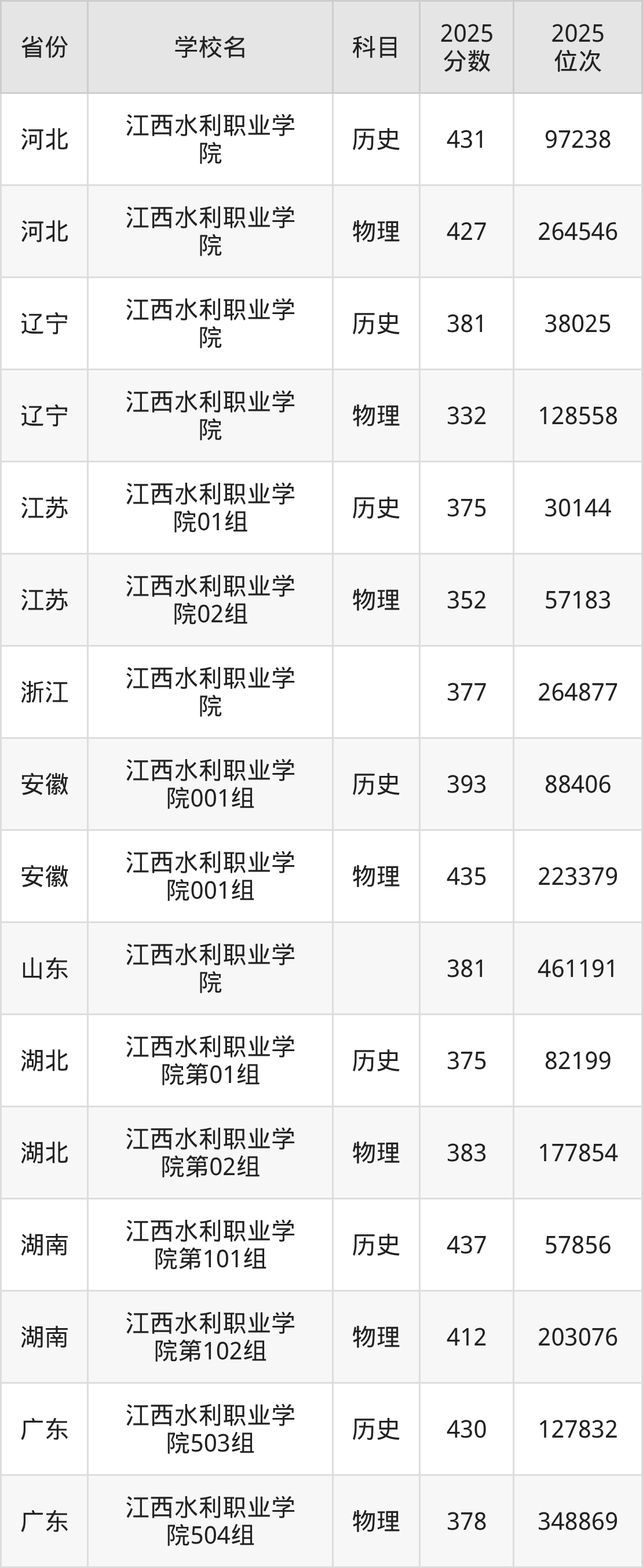 2025年江西水利职业学院在省内分历史物理科目类录取,其中历史类最低分是378分、对应位次是119774名;物理类最低分是303分,对应位次是245262名。