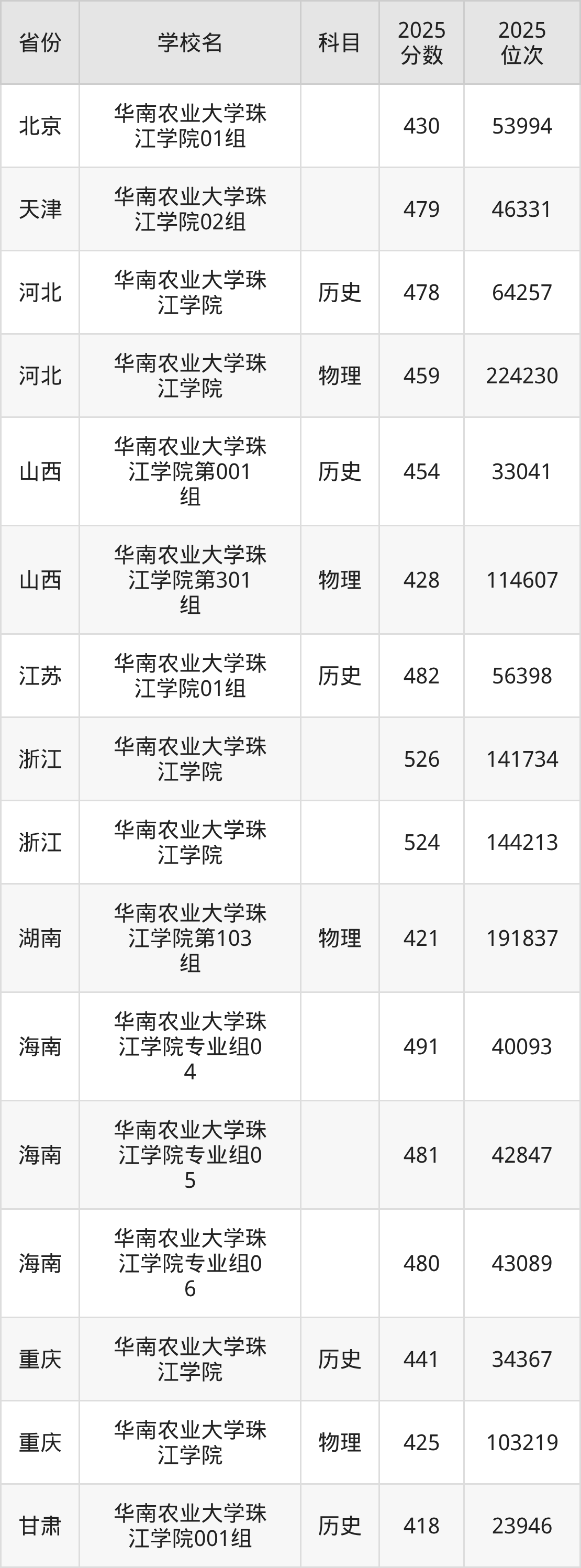 2026年华南农业大学珠江学院录取分数线预计在450分及以上,在各省录取最低分存在一定差异,如:2025年华南农业大学珠江学院在北京录取最低分是430分,在山西录取最低历史类454分、物理类428分,在江苏录取最低历史类482分。